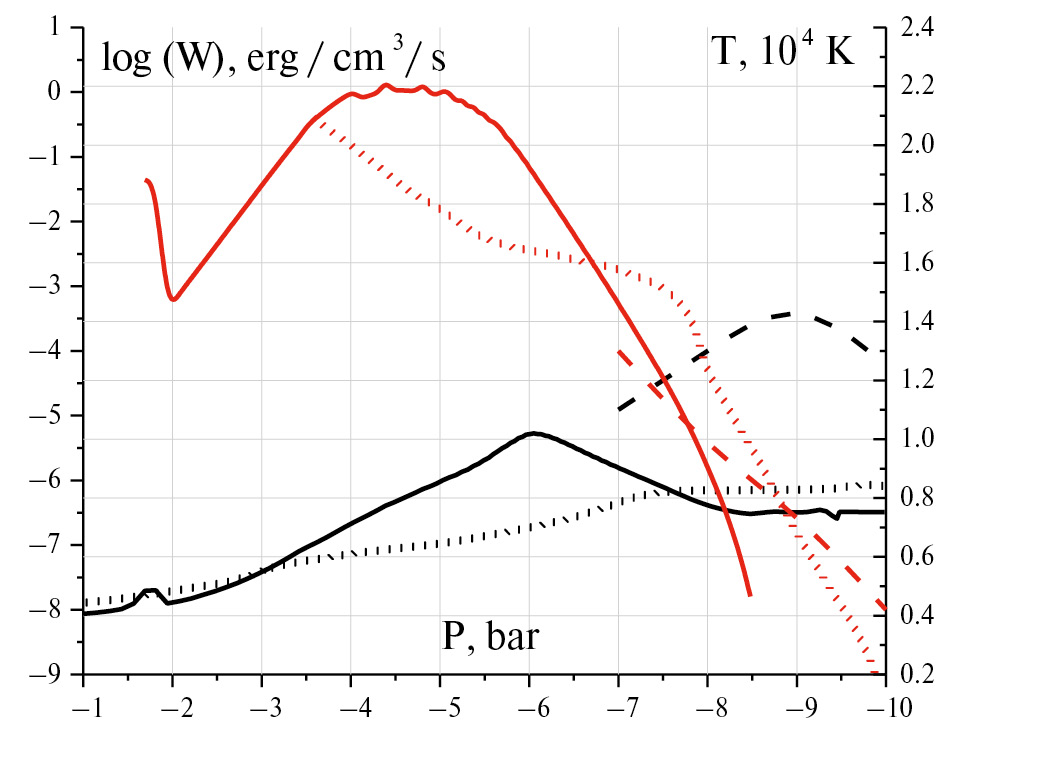 Популяция ионов HI – в общем случае не находится в ЛТР (см., например, [44]), и мы рассчитываем ее из соответствующих реакций, описанных в Приложении 2. В целом, основная роль HI – заключается в уменьшении непрозрачности плотного газа в VUV и оптической области, где поглощение другими элементами незначительно. На рис. 5 представлены профили, аналогичные рис. 2, но с учетом HI – . Видно, что фотоионизация HI – не вносит вклада в энергетический баланс. Основное отличие заключается в том, что в присутствии HI – температура повышается при давлениях <10 –3 бар более плавно. Причина этого была найдена в следующем. Имеется реакция нейтрализации HI – протоном с образованием возбужденного атома: HI – +p ↔ HI(n3) + HI(n1). Она имеет относительно большое сечение ≈10 –15 см 2 [45], поскольку протекает, для уровня n=3, с очень малым изменением энергии. Скорость обратной реакции, которая, по сути, является разрушением возбужденного состояния атома водорода в столкновении с невозбужденным атомом (HI в основном состоянии), может быть найдена из ЛТР соотношений. В плотной плазме с запертыми резонансными фотонами возбуждение из n=3 переходит в состояние n=2, то есть возбужденные состояния n≥2 можно считать находящимися в ЛТР соотношении между собой. Таким образом, скорость реакции HI(n2) + HI(n1) → HI – + p равна скорости для HI(n3), умноженной на коэффициент exp(– E 3,2 / kT ). По сути, популяция HI – сама по себе может быть не важна, но рассмотренная реакция может быть важна как канал разрушения возбужденного водорода.