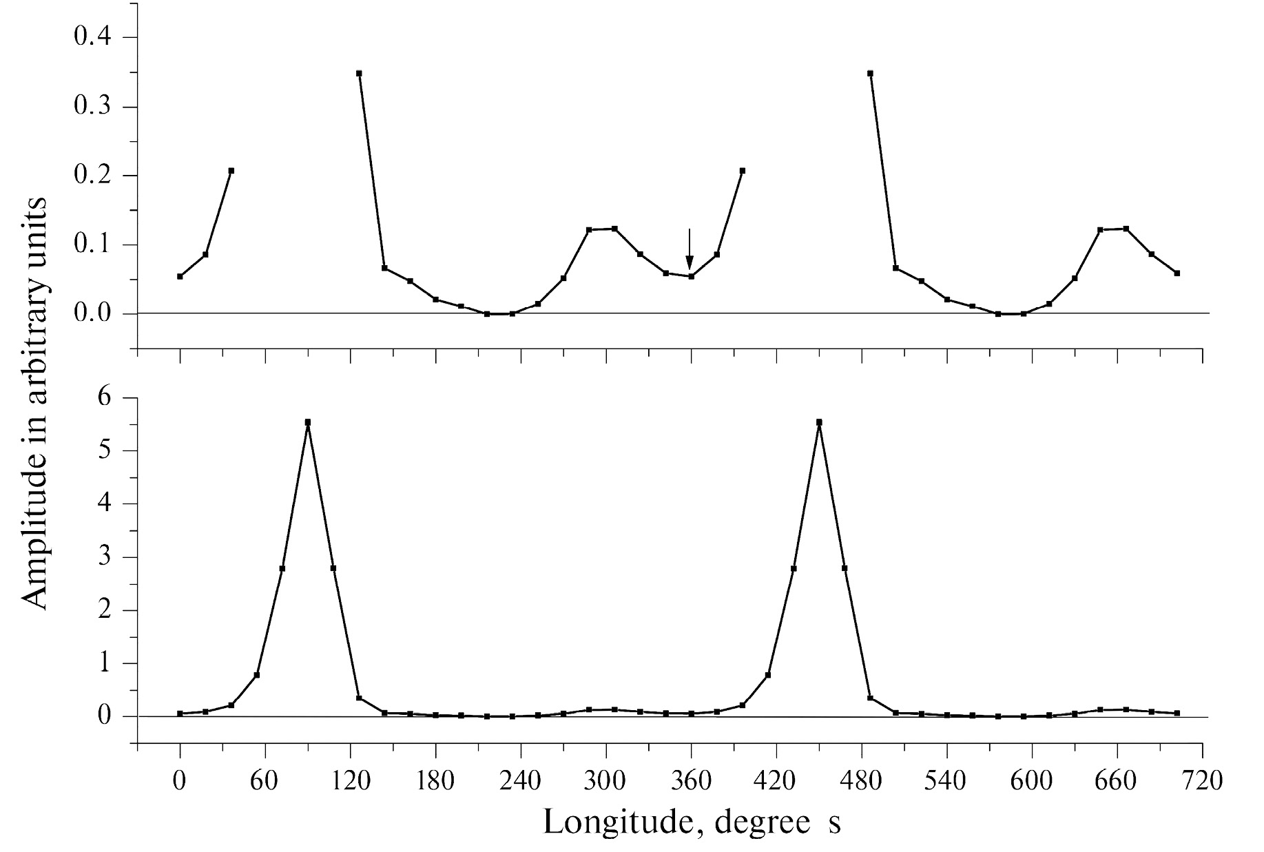 Пульсар наблюдался в двух смежных лучах, поэтому можно было следить за состоянием ионосферы, и если смещение координаты по склонению было большим, то эти сеансы не использовались для анализа. При наличии сильных помех такие записи также исключались из анализа. Кроме того, часть дней была использована для технических работ на антенне. Всего по перечисленным выше причинам было исключено 9.7% из общего числа сеансов. Поскольку излучение пульсара занимает почти весь период, для каждого сеанса на долготе минимального значения амплитуды среднего профиля формировался временной ряд амплитуд (положительные и отрицательные отклонения от среднего уровня) и затем по ним находилось значение уровня шумов ( ). Для каждого сеанса записывались значения , амплитуды MP, IP и моста для среднего профиля в отдельную таблицу за все дни наблюдений. Долгота, на которой определялась амплитуда моста, на рис. 1 отмечена стрелкой.