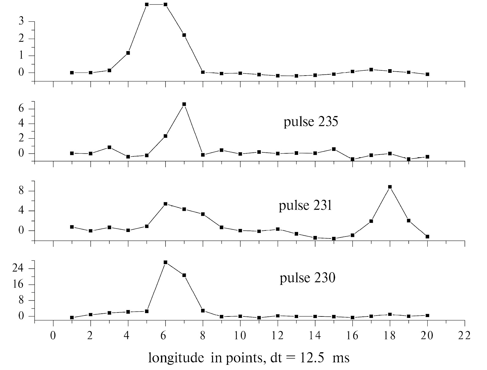 Рис. 3. Три индивидуальных импульса (снизу вверх) и средний за этот сеанс профиль (вверху). Макушка среднего профиля срезана (его амплитуда равна 10), чтобы лучше был виден IP. Ось y — амплитуда в относительных единицах, ось x — долгота в точках.