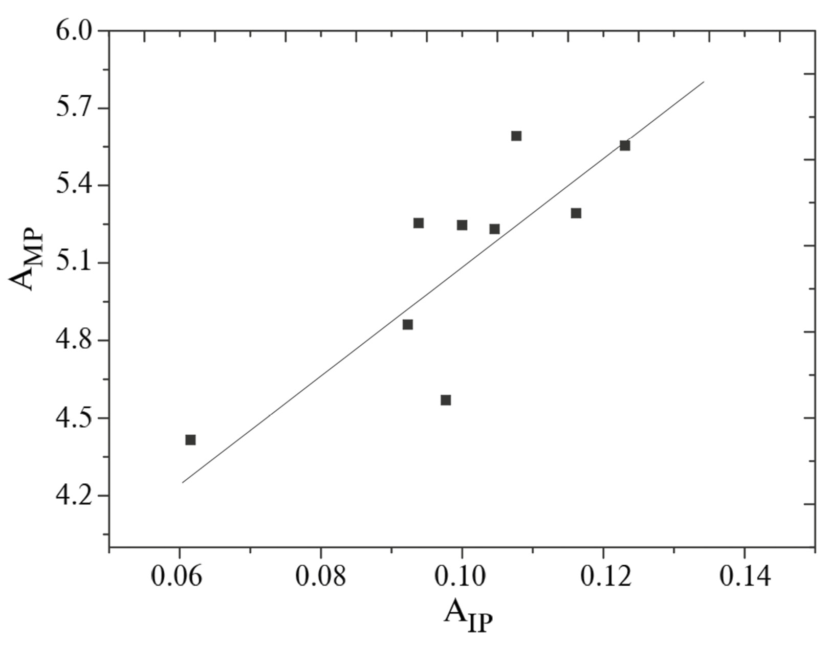 Рис. 4. Зависимость между амплитудами MP и IP по 9 годам наблюдений. Амплитуды даны в относительных единицах. Прямая соответствует подгонке методом наименьших квадратов.
