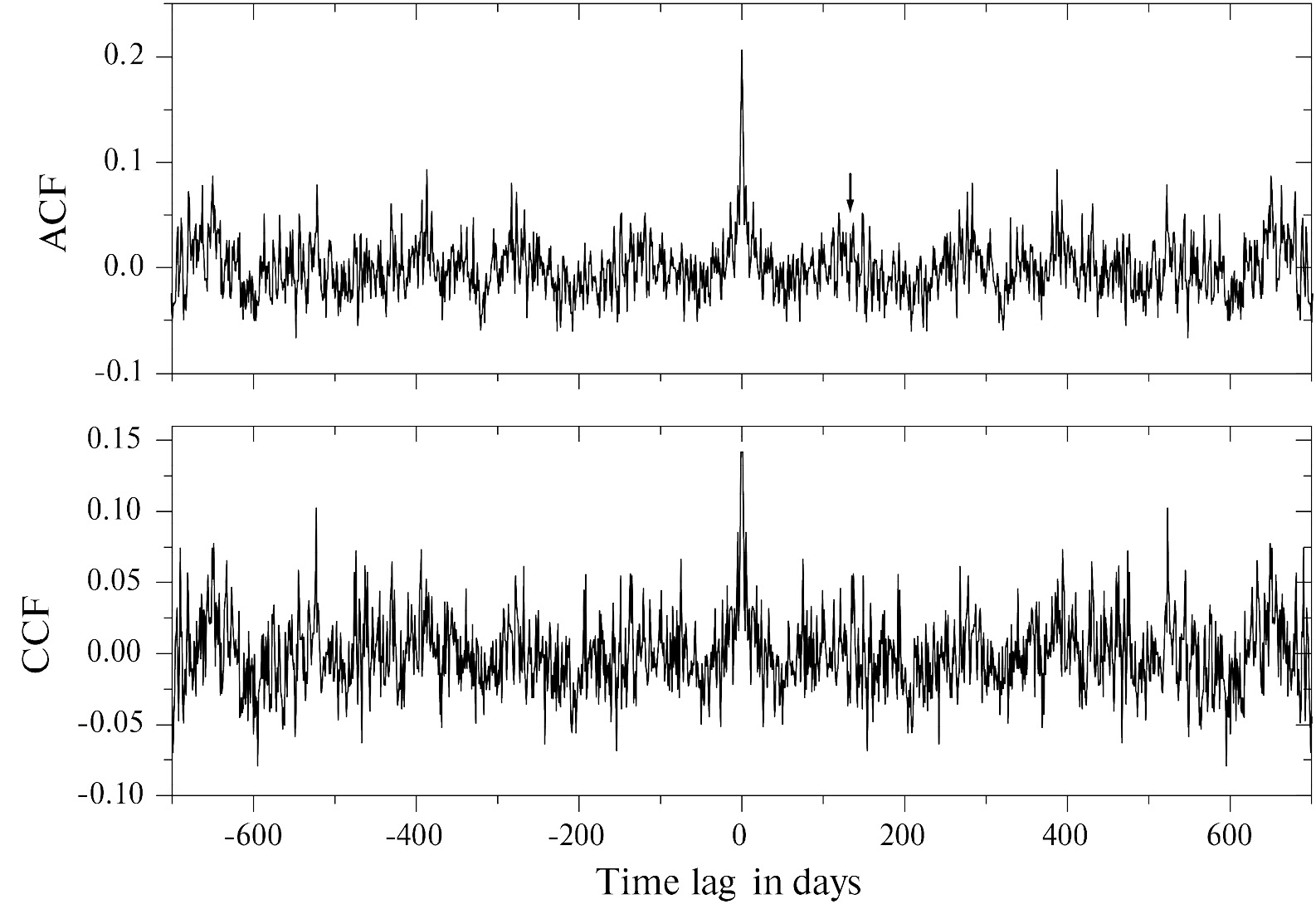 Рис. 5. Кросскорреляционная функция между амплитудами средних за сеанс профилей MP и IP (нижняя панель), при нулевом сдвиге значение CCF (0.63 для k = 0) заменено на значение при k = 1; автокорреляционная функция от вариаций амплитуд MP (верхняя панель). Стрелкой отмечен сдвиг в 130 дней.