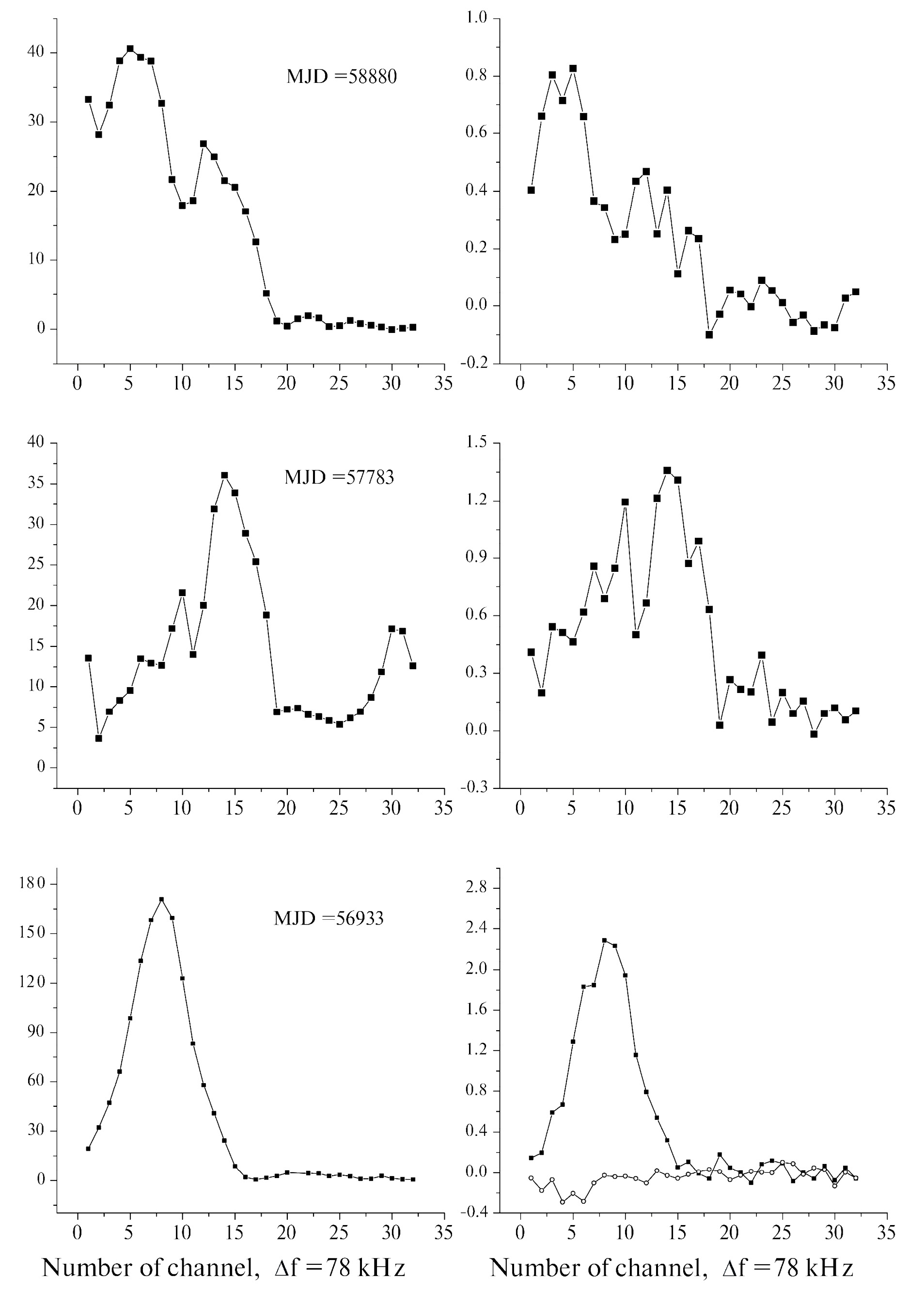 Для определения частотного масштаба мерцаний на долготах максимумов MP и IP мы анализировали накопленные за сеанс спектры (зависимости амплитуды от частоты) в 32-х каналах. Поскольку временной масштаб дифракционных мерцаний существенно больше времени одного сеанса, то мерцания по времени не окажет влияния на спектр. Такие спектры для трех сеансов наблюдений приведены на рис. 6. Видно, что спектры хорошо коррелируют, как по форме, так и по масштабу для MP и IP. Характерный частотный масштаб мерцаний определяется обычно по сдвигу, при котором происходит падение амплитуды корреляционной функции в 2 раза. Частотный масштаб сильно меняется от сеанса к сеансу в широких пределах: так для MJD 56933 кГц, а для MJD 58880 кГц. Частотные масштабы одинаковы для MP и IP.