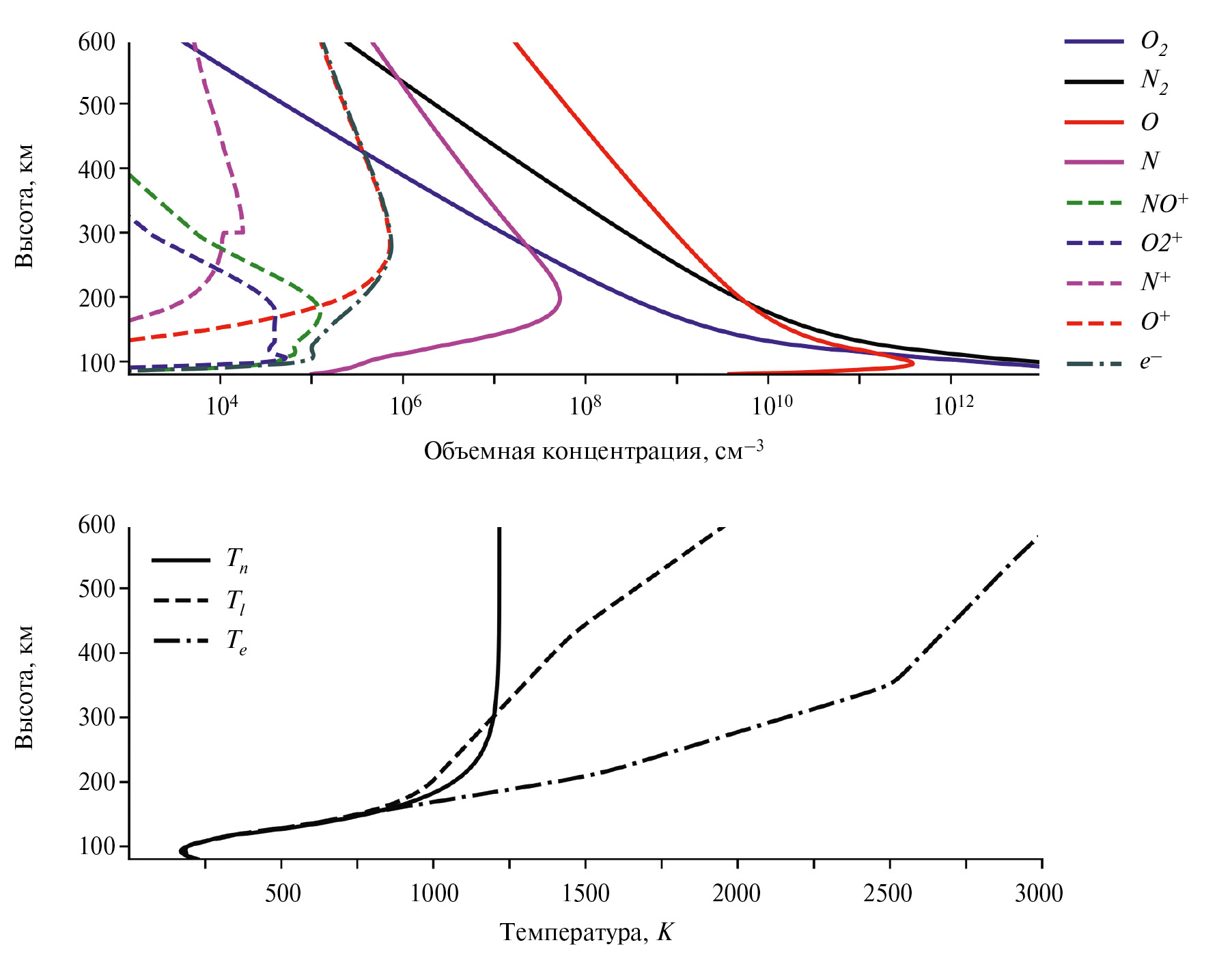 2. Fig. 1. (Top panel): Altitude profiles of the distribution of number concentrations of neutral components of the Earth's atmosphere O 2 , N 2 , O and N (solid lines), calculated using the MSISE90 model [40]; concentrations of ions O + , O 2 + , NO + , N + (dashed lines) and electrons (dash-dotted lines), calculated using the IRI2016 model [46]. (Bottom panel): Altitude distributions of temperatures of neutrals (solid line), ions (dashed line) and electrons (dash-dotted line), taken from the MSISE90 [40] and IRI2016 [46] models, respectively. The calculations were performed for September 21, 1999, latitude 65°N and longitude 0°.