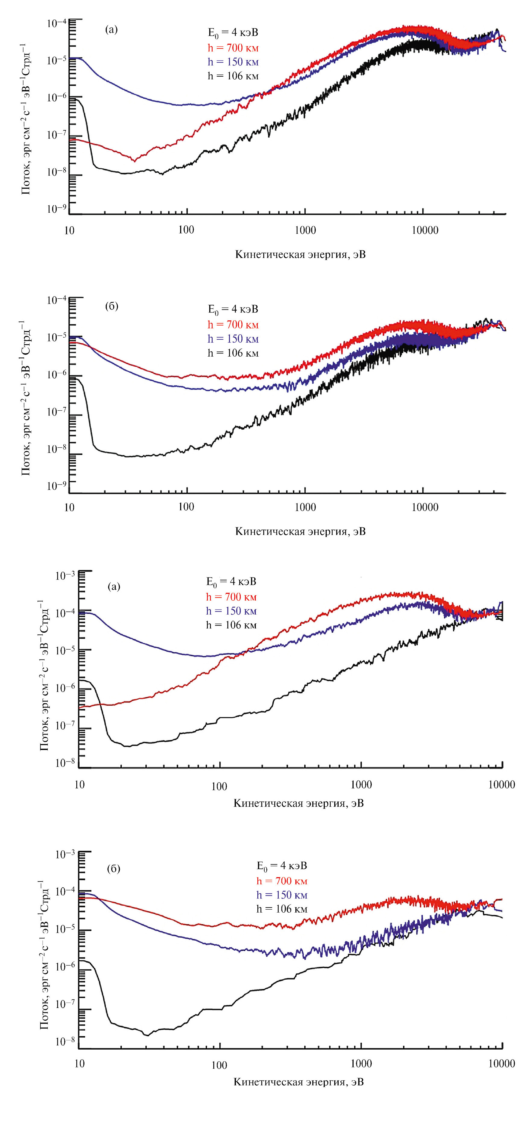 3. Fig. 2, a. Energy spectra of the descending (upper panel, a) and ascending (lower panel, b) energy fluxes of auroral electrons precipitating with characteristic energy E 0 = 4 keV. Fig. 2, b. Energy spectra of the descending (upper panel, a) and ascending (lower panel, b) energy fluxes of auroral electrons precipitating with characteristic energy E 0 = 1 keV.