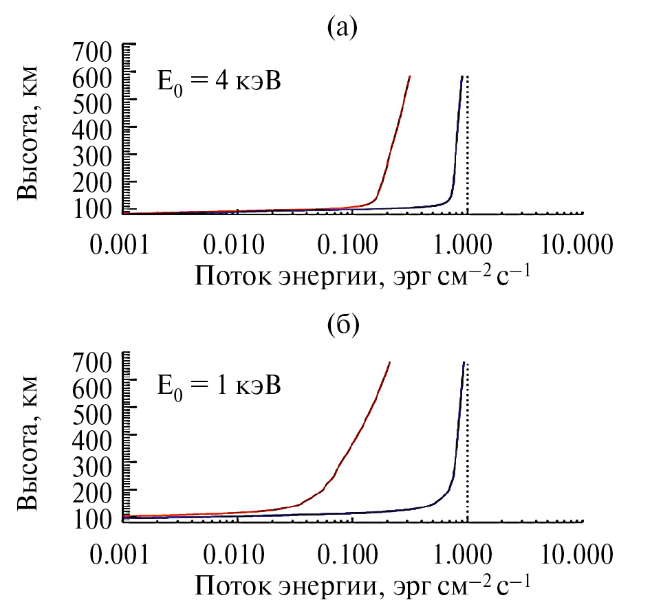 4. Fig. 3. Altitude profiles of the downward (blue line) and upward (red line) energy flux of auroral electrons precipitating with characteristic energy E 0 = 4 keV (upper panel) and 1 keV (lower panel). The vertical dotted line shows the energy flux of auroral electrons at the upper boundary Q 0 = 1 erg cm –2 s –1 .