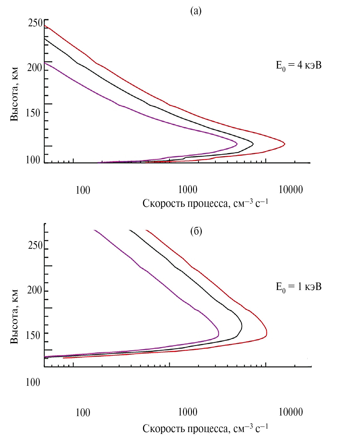 5. Fig. 4. Altitude profiles of the rates of dissociation (black line), ionization (red line) and dissociative ionization (crimson line) of molecular nitrogen by the flux of auroral electrons precipitating with characteristic energy E 0 = 4 keV (upper panel) and 1 keV (lower panel).