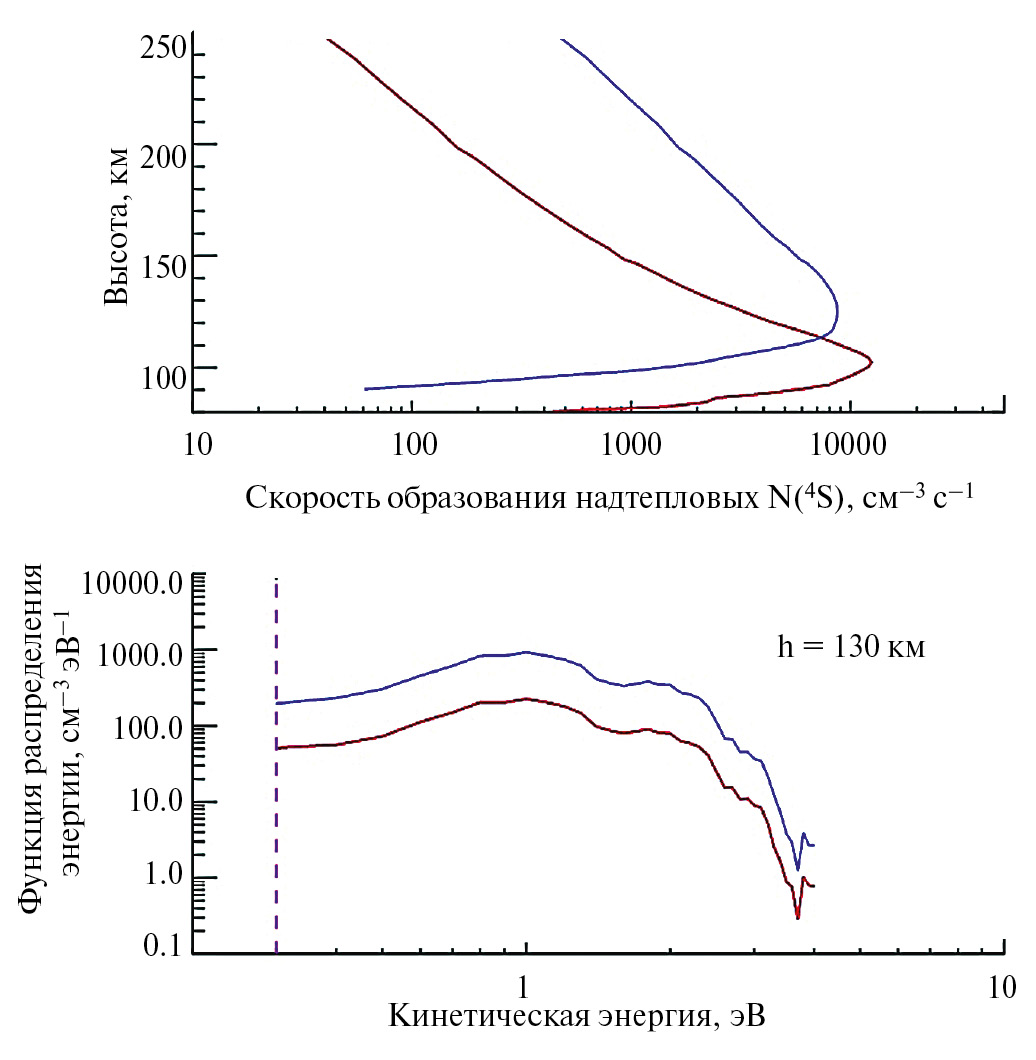 6. Fig. 5. Altitude profiles of the formation rate of atomic nitrogen in the ground state 4 S (upper panel) and their energy spectra at an altitude of 130 km (lower panel) during the precipitation of auroral electrons with characteristic energy E 0 = 4 keV (red lines) and 1 keV (blue lines). The vertical line shows the energy barrier for the reaction of atomic nitrogen in the ground state 4 S with molecular oxygen.