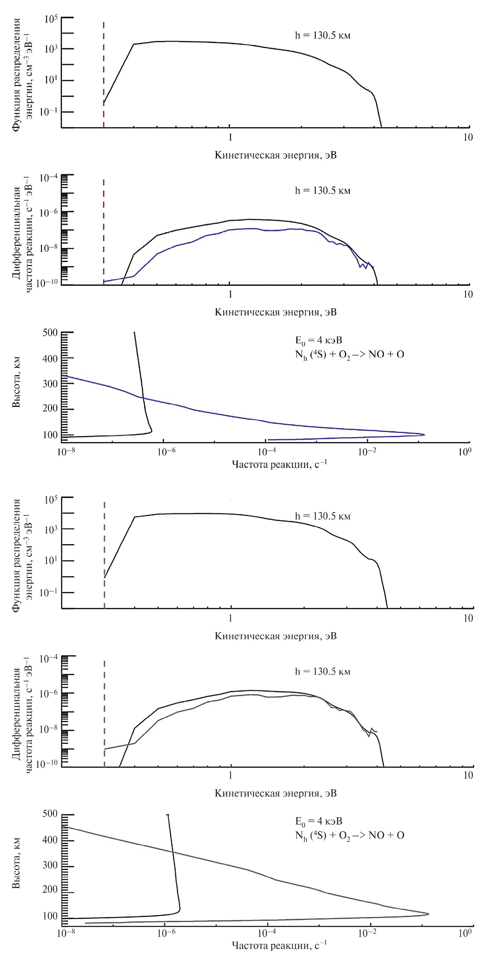 7. Fig. 6, a. (Top panel): Stationary distribution function of suprathermal nitrogen atoms calculated for the altitude of 130.5 km and the characteristic energy of precipitating electrons E 0 = 4 keV, (Middle panel): Energy spectra of the differential frequency of reaction (6) at the altitude of 130.5 km calculated using the stationary distribution function (black curve) and the source function (4) (blue curve) of suprathermal N( 4 S) atoms. The vertical line shows the energy barrier for reaction (6). (Bottom panel): Altitude profiles of the frequency of reaction (6) calculated using the stationary distribution function (black curve) and the source function (4) (blue curve) of suprathermal N( 4 S) atoms. Fig. 6, b. The same as in Fig. 6a, but for the case of precipitation of auroral electrons with the characteristic energy E 0 = 1 keV.