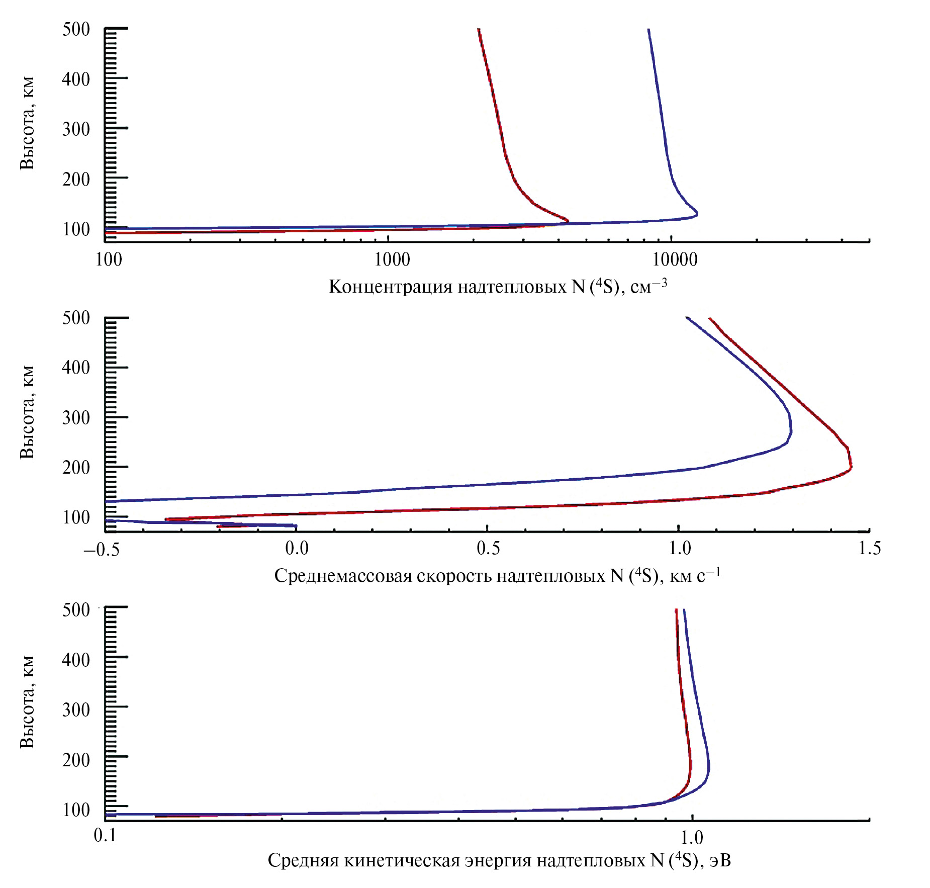 8. Fig. 7. Altitude profiles of the physical properties of suprathermal nitrogen atoms N(4S): (upper panel) volume concentration, (middle panel) average mass velocity and (lower panel) average kinetic energy. Blue lines correspond to the characteristic energy of precipitating electrons E0 =1 keV, red lines – E0 =4 keV.