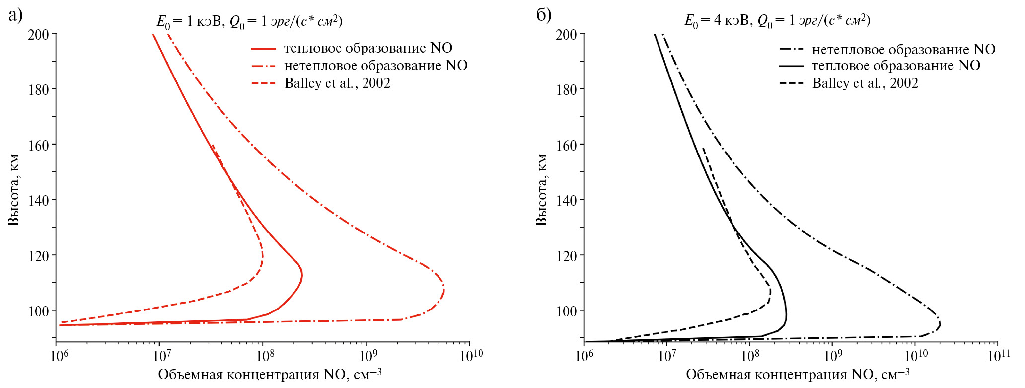 9. Fig. 8. a) Altitude distributions of the volume concentration of NO formed in the thermal (solid curve) and non-thermal (dash-dotted curve) channels. The dotted line shows the altitude profile of the NO concentration from [47]. The altitude profiles correspond to electron precipitation with a characteristic energy of E 0 = 1 keV. b) Altitude distributions of the volume concentration of NO formed in the thermal (solid curve) and non-thermal (dash-dotted curve) channels. The dotted line shows the altitude profile of the NO concentration from [47]. The altitude profiles correspond to electron precipitation with a characteristic energy of E 0 = 4 keV.