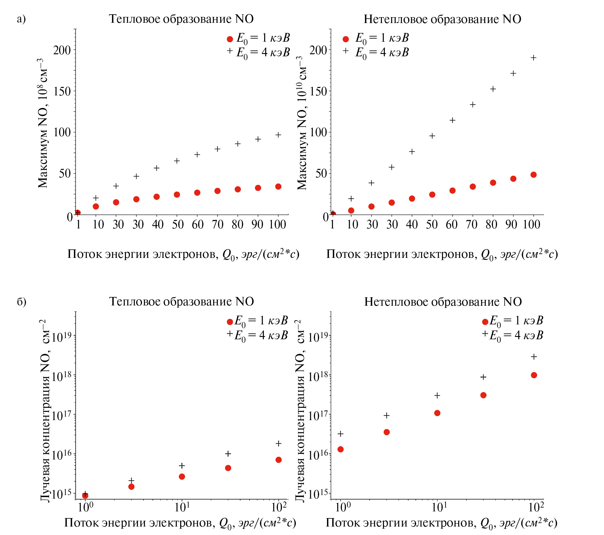 10. Fig. 9. a) Dependence of the maximum concentration of nitric oxide formed in the thermal (left panel) and non-thermal (right panel) channels on the energy flux of precipitating electrons in the atmospheres of terrestrial planets located within the potential habitability zone of active host stars. Red circles correspond to electron precipitation with the characteristic energy E 0 = 1 keV; black crosses — for the case with E 0 = 4 keV. b) Dependence of the vertical column concentration of nitric oxide formed by the thermal (left panel) and non-thermal (right panel) paths on the energy flux of precipitating electrons in the atmospheres of terrestrial planets located within the potential habitability zone of active host stars. Red circles correspond to electron precipitation with the characteristic energy E 0 = 1 keV; black crosses — for the case with E 0 = 4 keV.