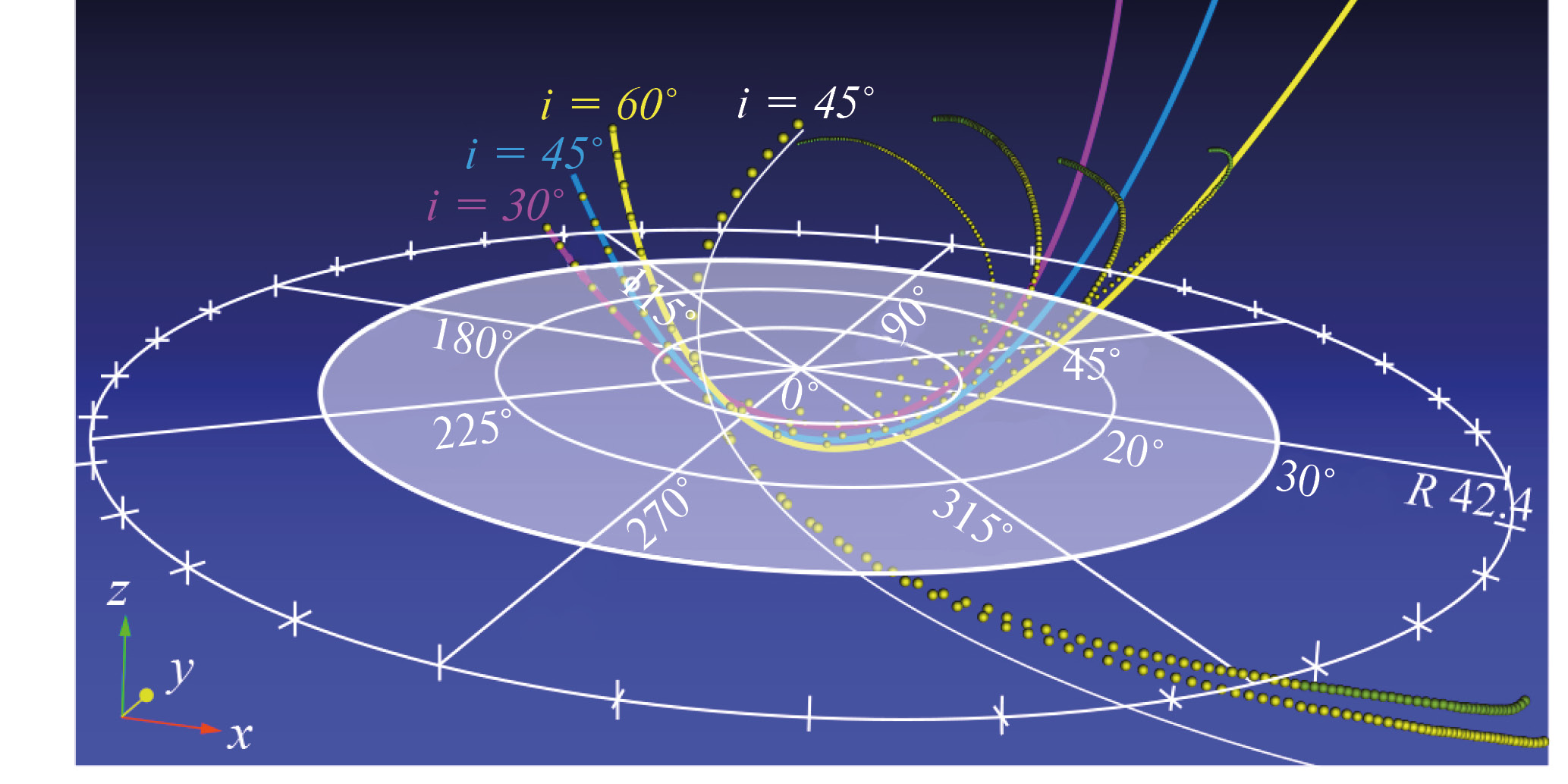 Параметры расчетов подбирались так, чтобы первое пересечение плоскости диска центром масс падающего вещества было примерно в одном и том же месте а. е., 0°, 225°).