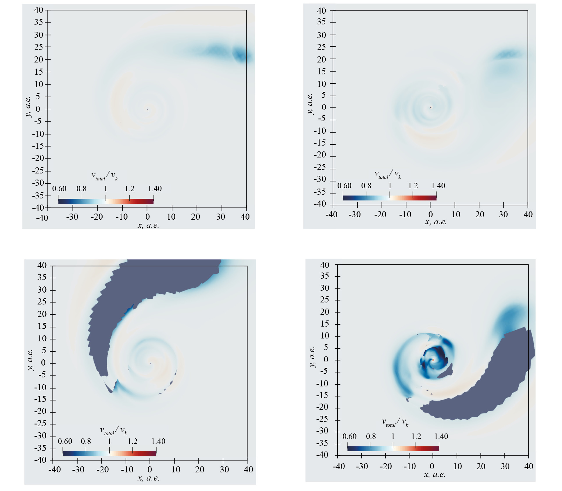Следует отметить, что в данных расчетах не учитывался перенос излучения. Результаты расчетов показали, что после столкновения вещества струи с диском происходит нагрев газа до нескольких тысяч градусов Кельвина в области столкновения вследствие адиабатического сжатия. Затем нагретая область растягивается в спираль кеплеровским вращением диска и распространяется на периферию диска, прогревая его. К моменту времени 150 лет спиральная структура располагается в пределах радиуса 45 а. е. Таким образом, перенос тепла происходит со скоростью а. е. за лет. В работе [73] показано, что характерное время тепловой релаксации вещества диска массой под действием радиативных процессов на расстоянии 7.5 а. е. составляет года и убывает с ростом расстояния и температуры. Таким образом, диск должен эффективно охлаждаться излучением. Тогда, как было отмечено в работе [72], вспышка аккреционной активности звезды, вызванная падением сгустка на диск, также должна сопровождаться усилением инфракрасного излучения из возмущенной области диска.