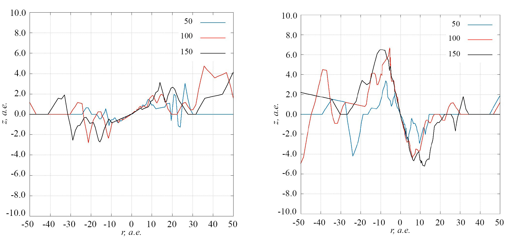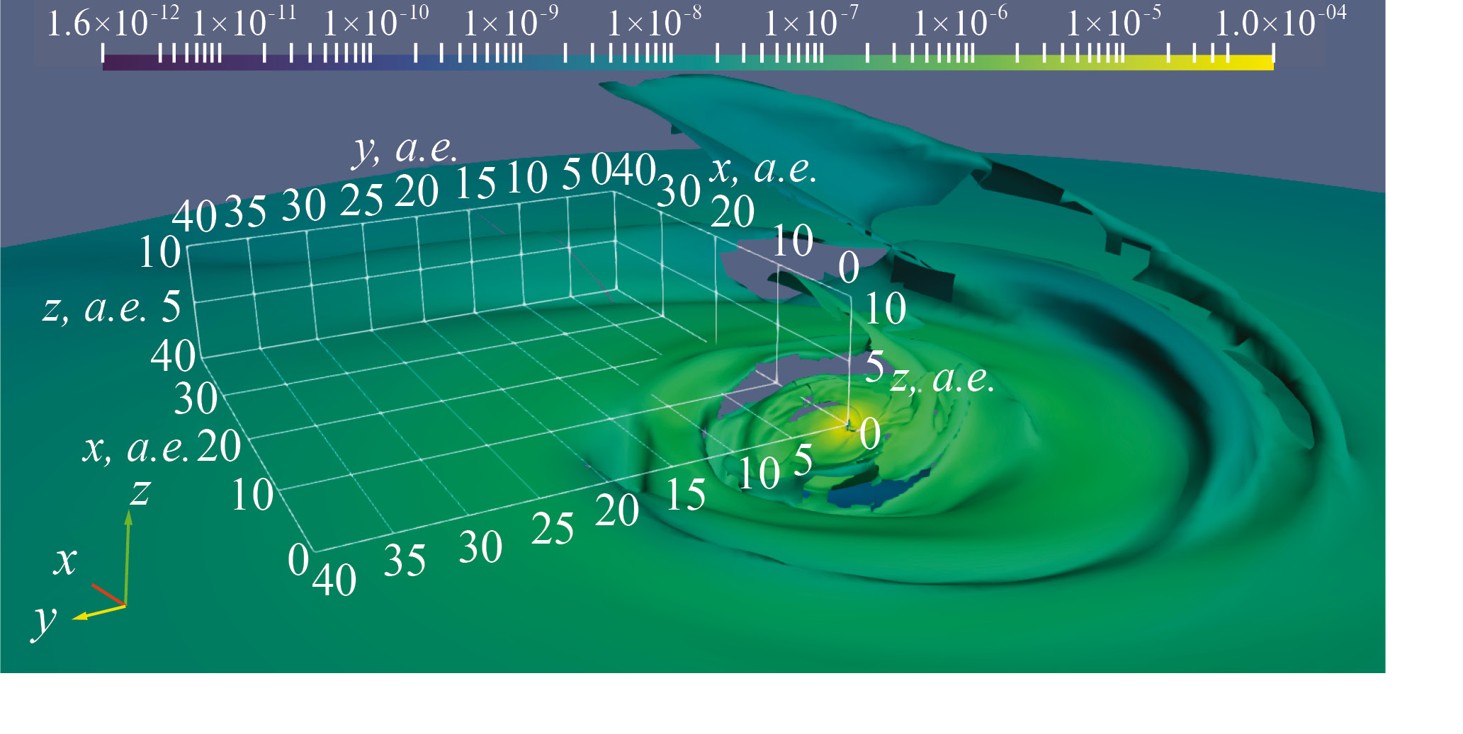 где , cS локальная скорость звука, а H характерный вертикальный масштаб диска (в начальный момент времени определяется формулой (13), см. ниже). В расчетах было принято, что , где Ω локальная кеплеровская угловая скорость. Данное соотношение применимо в случае вертикального гидростатического равновесия, которое сохраняется до касания вещества струи с поверхностью диска. В дальнейшем, когда начальная плоскость диска искажается, может быть выделена поверхность максимальной плотности, относительно которой можно оценить средний характерный вертикальный масштаб диска (по аналогии с распределением (12), см. ниже: при фиксированных и ). Расчеты показали соответствие по порядку величины полученного таким образом характерного вертикального масштаба диска и отношения скорости звука к локальной кеплеровской скорости в течение всего времени моделирования. Отклонение от значения может быть скорректировано вариациями параметра в пределах . Вариации α могут быть обоснованы физическими процессами, протекающими в диске и влияющими на перенос углового момента (см., напр., [52]), но не учитываемыми при данном моделировании.