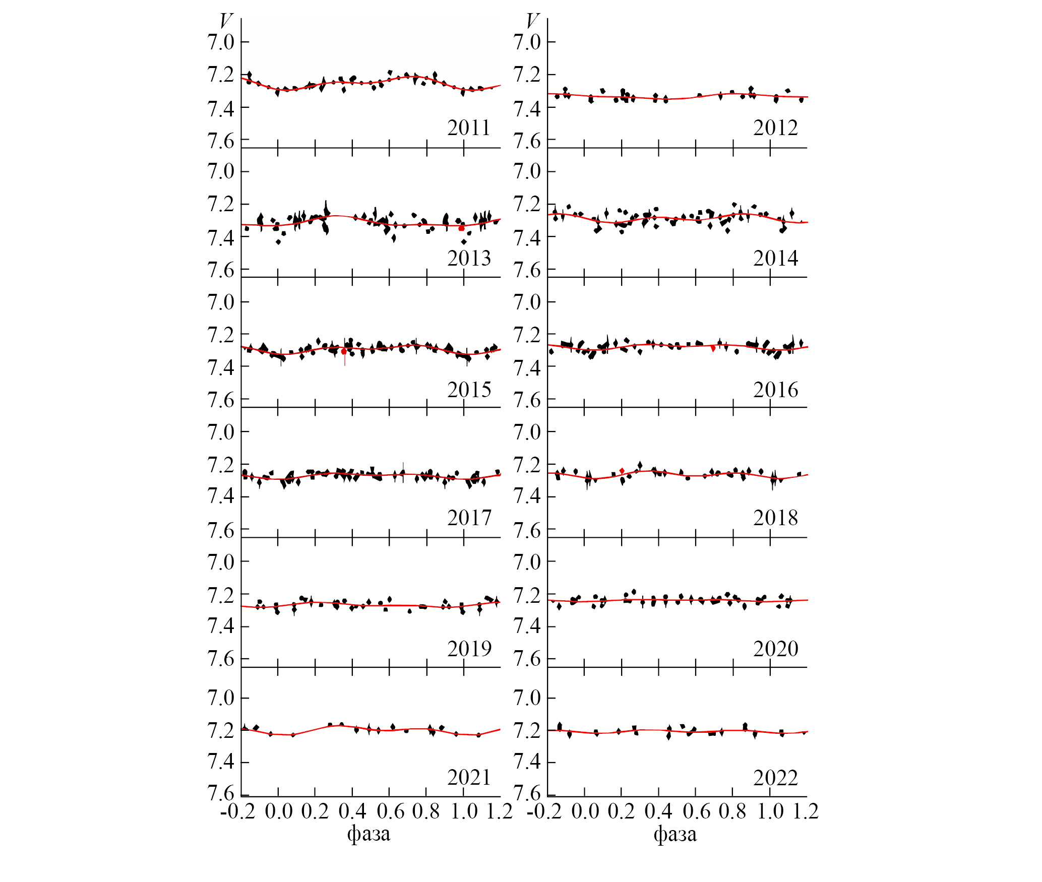 Рис. 2. Кривые блеска V772 Her по данным KWS. Точки с барами — средние за ночь значения блеска в полосе V, красные линии — аппроксимация сезонных кривых блеска двумя первыми Фурье-гармониками.