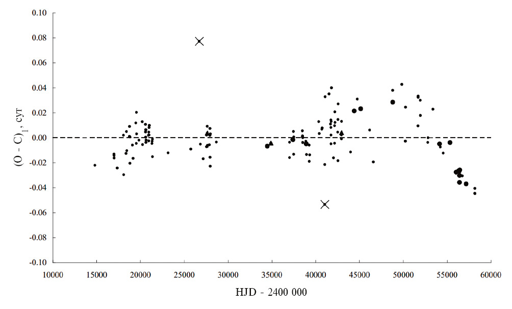 Рис. 1. Разности (O – C)1 между наблюдаемыми моментами минимумов δ Lib и вычисленными с линейными элементами (1). Фотографические наблюдения представлены в виде треугольников, визуальные — маленькими точками, фотоэлектрические и ПЗС — большими точками. Крестиками помечены точки, которые не использовались при анализе изменений периода.