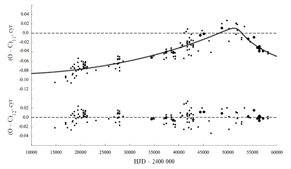 Обратная парабола означает, что происходит вековое уменьшение периода. Для SX Lyn коэффициент при квадратичном члене Q = – 5.56d × 10–9 и скорость уменьшения периода dP/dt = – 2.0 × 10–6 сут/год. Вековое уменьшение периода может быть вызвано потерей углового момента системы вследствие магнитного торможения [19, 20].