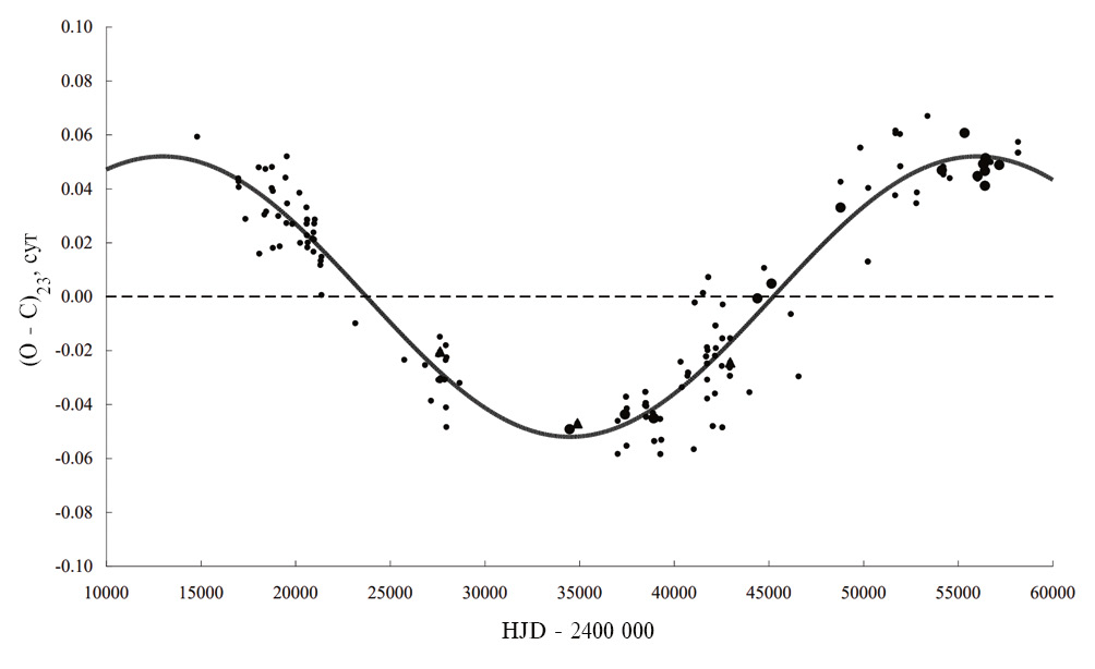 Параметры светового уравнения определялись так же, как в предыдущем случае, они приведены в табл. 2. Отметим, что вместо подозреваемого ранее векового увеличения периода наблюдается его уменьшение. На рис. 3 приведены разности (O – C)21 между наблюдаемыми моментами минимумов δ Lib и вычисленными с линейными элементами из представления (3). Сплошной линией показана сумма теоретических кривых для параболы и светового уравнения с параметрами из табл. 2. В нижней части рис. 3 приведены значения (О – С)22 , полученные вычитанием из (О – С)21 параболы и светового уравнения. Обозначения те же, что на рис. 1. На рис. 4 приведены разности (О – С)23 , полученные вычитанием из отклонений наблюдаемых моментов минимумов δ Lib от вычисленных с линейными элементами (3) теоретической кривой для параболы (3). Сплошной линией показана теоретическая кривая для светового уравнения с параметрами из табл. 2. Обозначения те же, что на рис. 1.