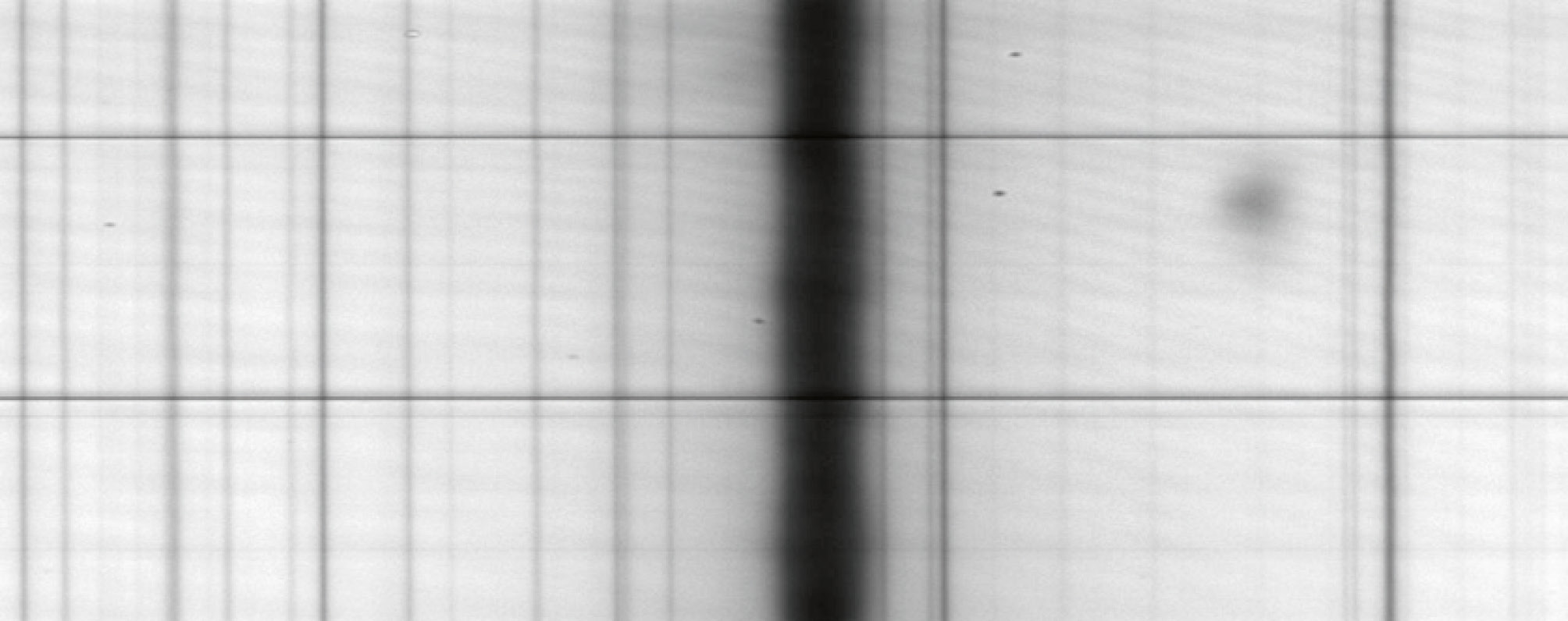 Рис. 3. Вид падающего фрагмента в линии Hα. Расстояние между горизонтальными реперными линиями соответствует 5 × 104 км.