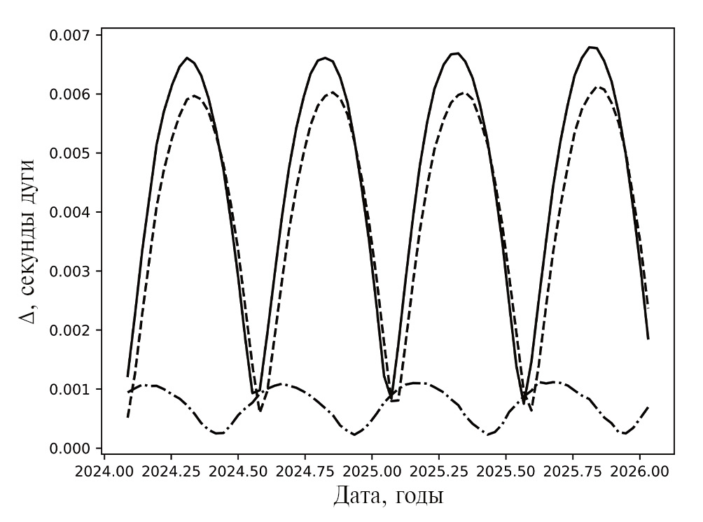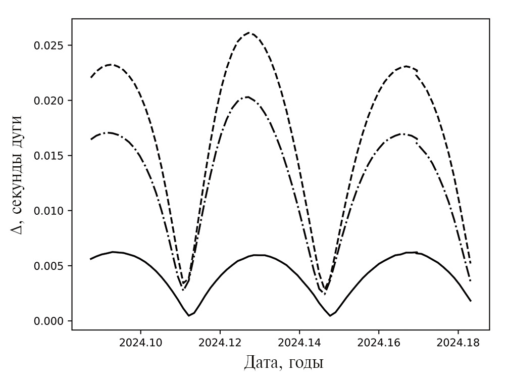 Рис. 1. Расстояние между эфемеридами положения на небе Солнца в теориях INPOP, EPM и JPL DE на интервале времени с 01.01.2024 по 01.01.2026. Сплошной линии соответствует разность EPM–INPOP, штрих-пунктирной линии — разность EPM–DE, штриховой линии — разность DE–INPOP.