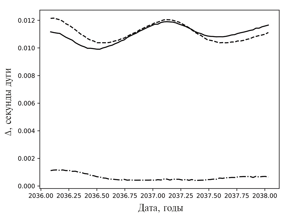 Рис. 4. Расстояние между эфемеридами положения на небе планеты Сатурн в теориях INPOP, EPM и JPL DE на интервале времени с 01.01.2036 по 01.01.2038. Сплошной линии соответствует разность EPM–INPOP, штрих-пунктирной линии — разность EPM–DE, штриховой линии — разность DE–INPOP.