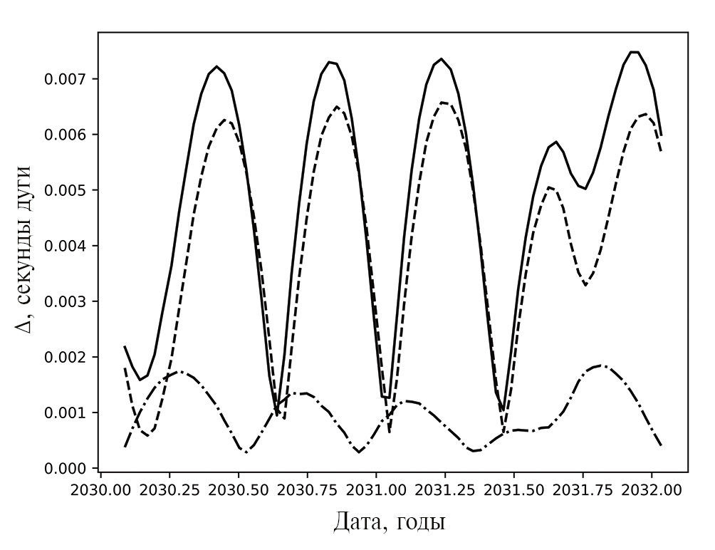 Рис. 3. Расстояние между эфемеридами положения на небе планеты Юпитер в теориях INPOP, EPM и JPL DE на интервале времени с 01.04.2030 по 01.04.2032. Сплошной линии соответствует разность EPM–INPOP, штрих-пунктирной линии — разность EPM–DE, штриховой линии — разность DE–INPOP.