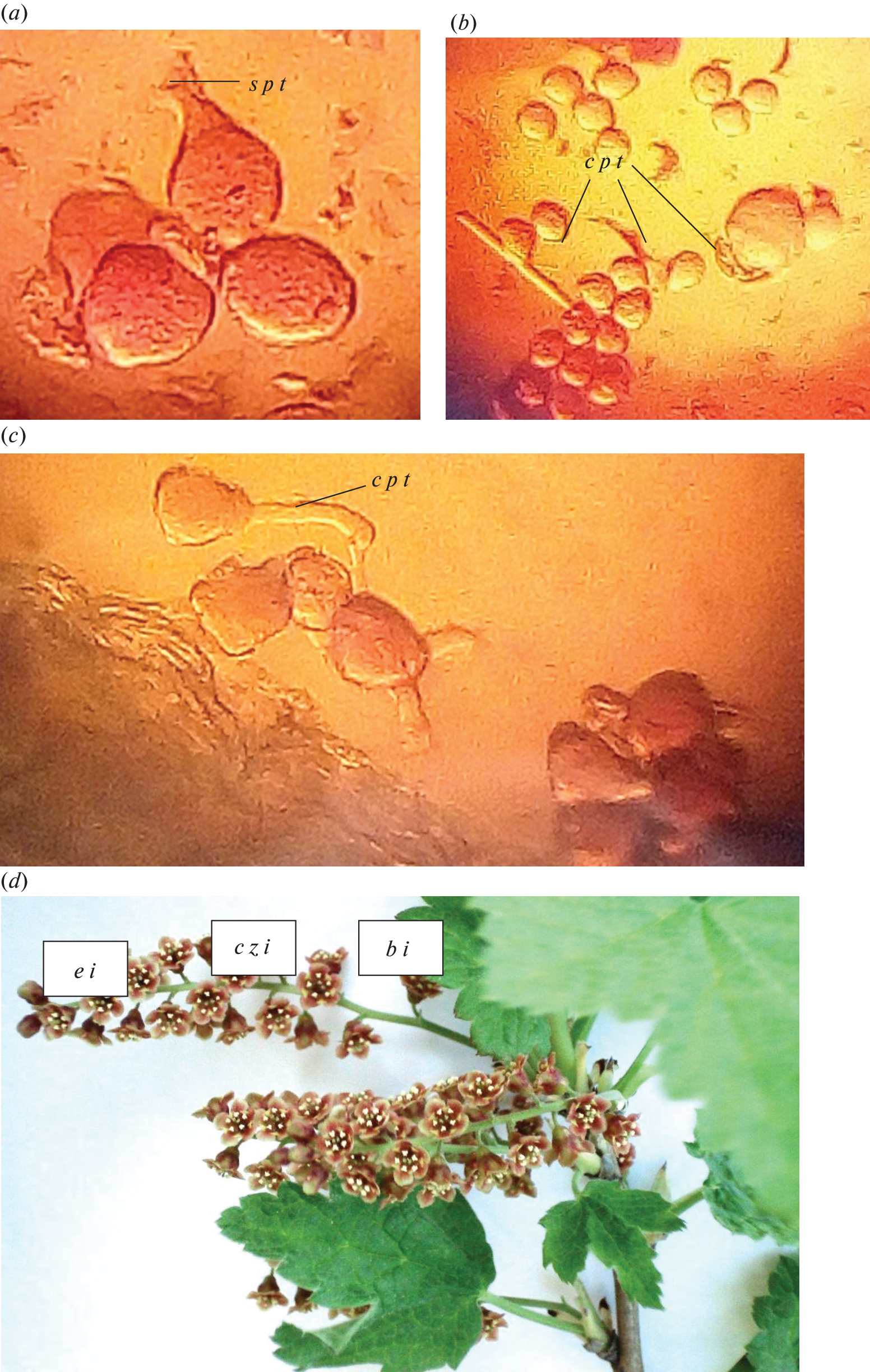 Изучено строение пыльцевого зерна и опыление у ряда представителей рода Ribes, которые произрастают на территории ботанических садов Ботанического института им. В.Л. Комарова РАН и Всероссийского института генетических ресурсов растений им. Н.И. Вавилова (г. Санкт-Петербург). У исследуемых растений пыльца порово-оровая. Встречаются нарушения ее морфологии, причем более всего у Ribes mandshuricum, R. ussuriense, R. alpinum, R. dikusha, R. pauciflorum. Выявлен высокий процент морфологически сформированной (фертильной) пыльцы (80.3 ± 1.9–96.4 ± 1.0%) и невысокая ее жизнеспособность при проращивании. Лучше прочих прорастает пыльца R. sanguineum, R. spicatum, R. nigrum, R. ussuriense, R. aureum (45.0 ± 2.8–29.0 ± 2.5%). Установлено, что у некоторых видов пыльца способна прорастать внутри пыльника. Выявлены опылители цветков Ribes – представители Apis, Bombus и Chrysopa oculatа. Прорастание пыльцевого зерна на рыльце пестика активное. Прохождение пыльцевой трубки до семязачатка длится 3–5 суток. В завязи развиваются 4 геми-ортотропных семязачатка в 6–10 “этажей”. Пыльца попадает на рыльце в двухклеточном состоянии, деление генеративной клетки с образованием спермиев происходит в пыльцевой трубке. Менее всего нарушений, касающихся структуры пыльцы и процессов опыления в условиях Санкт-Петербурга, у R. sanguineum, R. spicatum, R. nigrum, R. aureum.