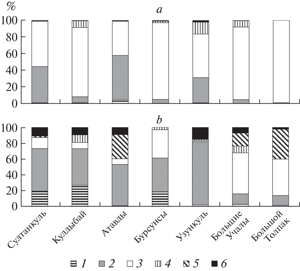 The phytoplankton in a number of lakes in the Bashkir Trans-Urals (Atavdy, Sultankul (2017), Bursunsy, Kuldybay (2019), Bolshiye Uchaly, Uzunkul (2021)) and Bashkir Pre-Urals (Bolshoy Tolpak, 2022)) was studied. As a result of the study, the taxonomic structure, quantitative characteristics, dominant species, distribution features of main algal groups were reveald, and their ecological and geographical characteristics werre identified. 257 species and intraspecific taxa of algae from 9 divisions were registered in the algal flora. Green algae (33%), cyanoprokaryotes and diatoms (21% each of total species number) show the highest species diversity in the lakes. The algal flora is specific for each lake and has low degree of floristic similarity (0.13–0.57 according to Sørensen coefficients). In the ecological and geographical terms, the algal floras of lake plankton is represented by typical planktonic species, widespread in waterbodies of the globe, indifferent to water salinity, living only in fresh waterbodies and preferring neutral waters. Quantitative indicators of phytoplankton varied in a wide range of values: number of cells from 4.4 to 344 mln cells/L, biomass from 0.23 to 22.97 mg/L. Dominant species in terms of abundance are represented predominantly by cyanoprokaryotes (Snowella lacustris, Aphanocapsa delicatissima, A. incerta, Aphanizomenon flos-aquae, Gloeotrichia echinulata, Merismopedia tenuissima, Pseudanabaena galeata, Planktolyngbya limnetica, Woronichinia compacta, Anathece clathrata, Rhabdoderma lineare), in terms of biomass by green (Oocystis lacustris, O. borgei, O. marssonii, Scenedesmus apiculatus), dinophyte (Peridinium cinctum, Gymnodinium sp., Ceratium furcoides), desmidium algae (Staurodesmus cuspidatus, Cosmarium contractum, C. cucumis) and cyanoprokaryotes (Pseudanabaena galeata, Aphanizomenon flos-aquae, Gloeotrichia echinulata). According to the value of the saprobity index (Pantle – Bucc by number 1.57–2.80), the lake waters correspond to β- and α-mesosaprobic types of waterbodies with III and IV water quality classes (moderately polluted or dirty water).