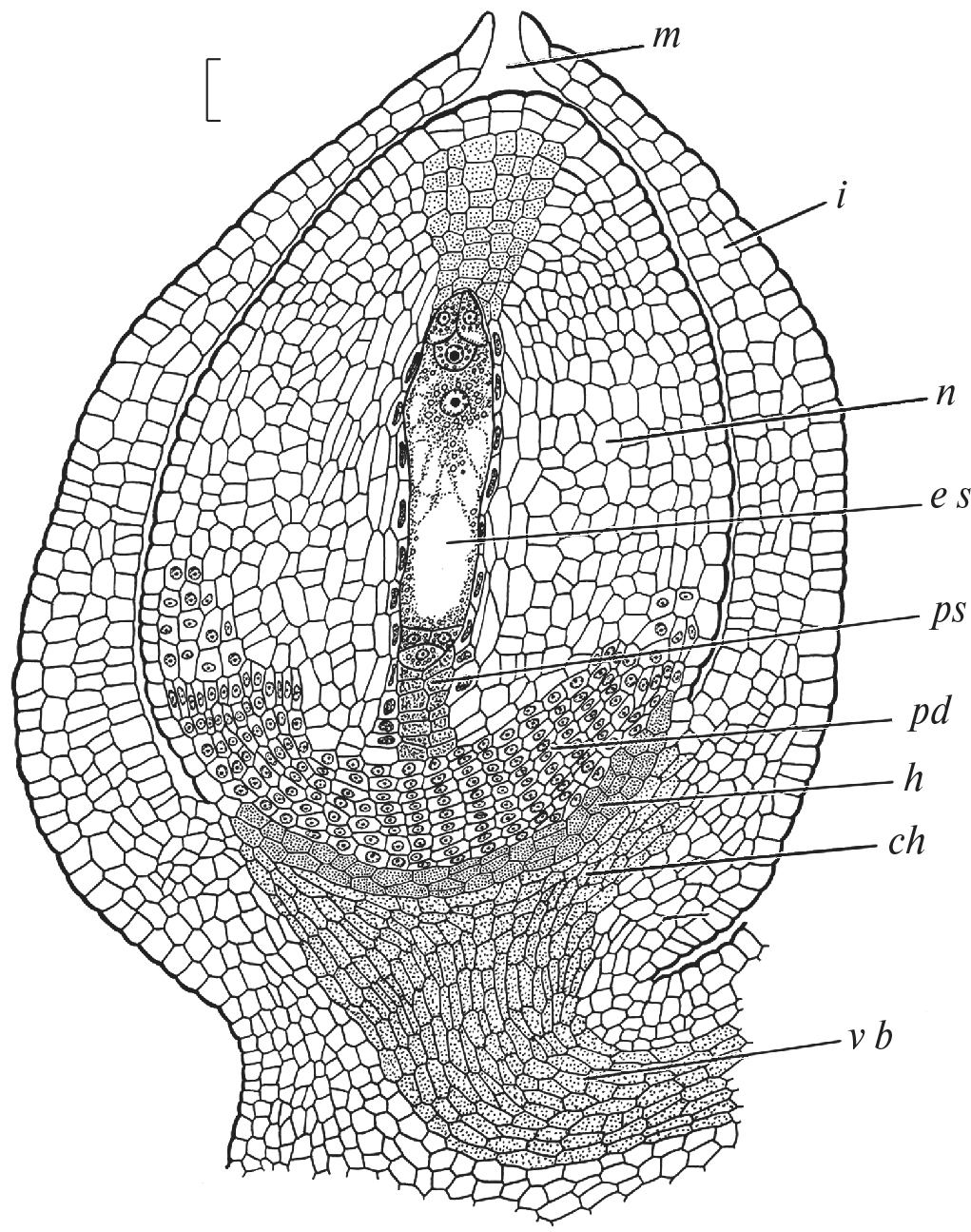 Fig. 2. Mature ovule structure in Ceratophyllum demersum (Ceratophyllaceae) (after Shamrov, 1997). e s – embryo sac, h – hypostase, i – integument, m – micropyle, n – nucellus, pd – podium, ps – postament, v b – vascular bundle. Scale bar, µm: 30.