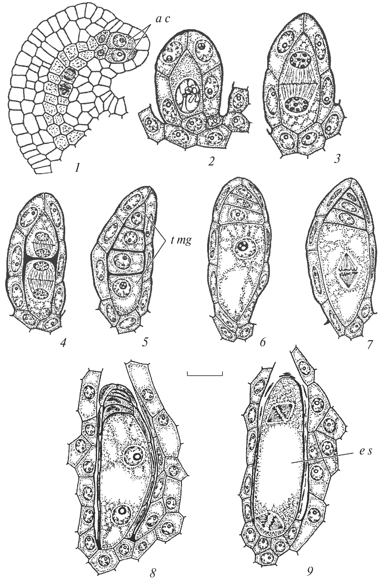 Fig. 3. Ovule structure at archesporium stage (1), megasporogenesis (2–5) and first stages of embryo sac development in (6–9) in Gentiana lutea (Gentianaceae) (after Shamrov, 1988). 1–9 – stages of development. a c – archesporial cells, e s – embryo sac, t mg – tetrad of megaspores. Scale bar, µm: 30.