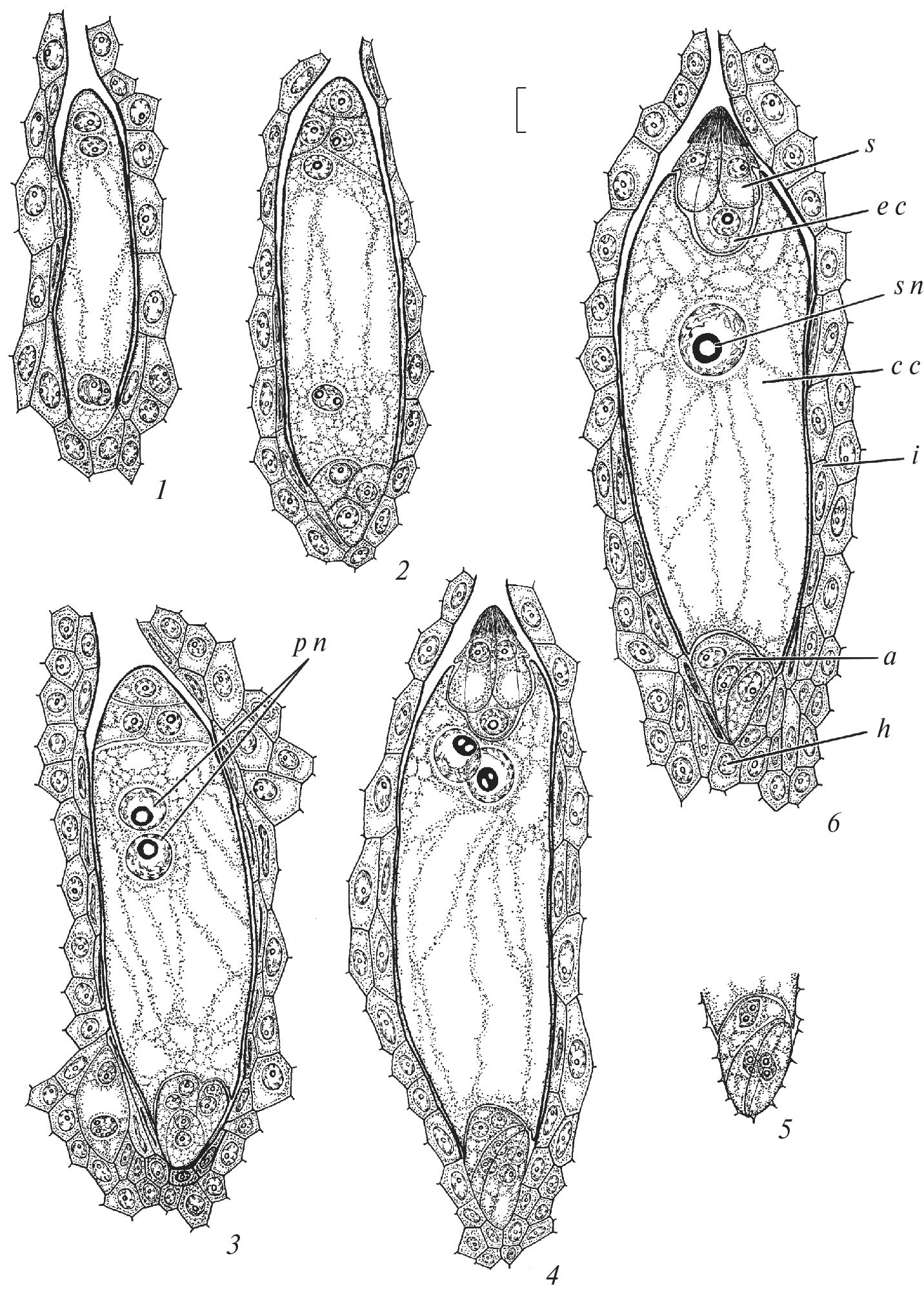 Fig. 4. Final stages of embryo sac formation in Gentiana lutea (Gentianaceae). 1–6 – stages of development (after Shamrov, 1988). a – antipodal cells, c c – central cell, e c – egg cell, h – hypostase, i – integument, p n – polar nuclei, s – synergid, s n – secondary nucleus of central cell. Scale bar, µm: 30.