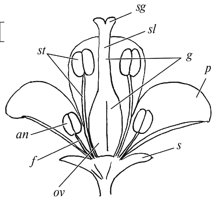 Fig. 6. Flower structure before pollination. an – anther, f – stamen filiform, g – gynoecium, p – petal, ov – ovary, s – sepal, sg – stigma, sl – style, st – stamen. Scale bar, µm: 30.
