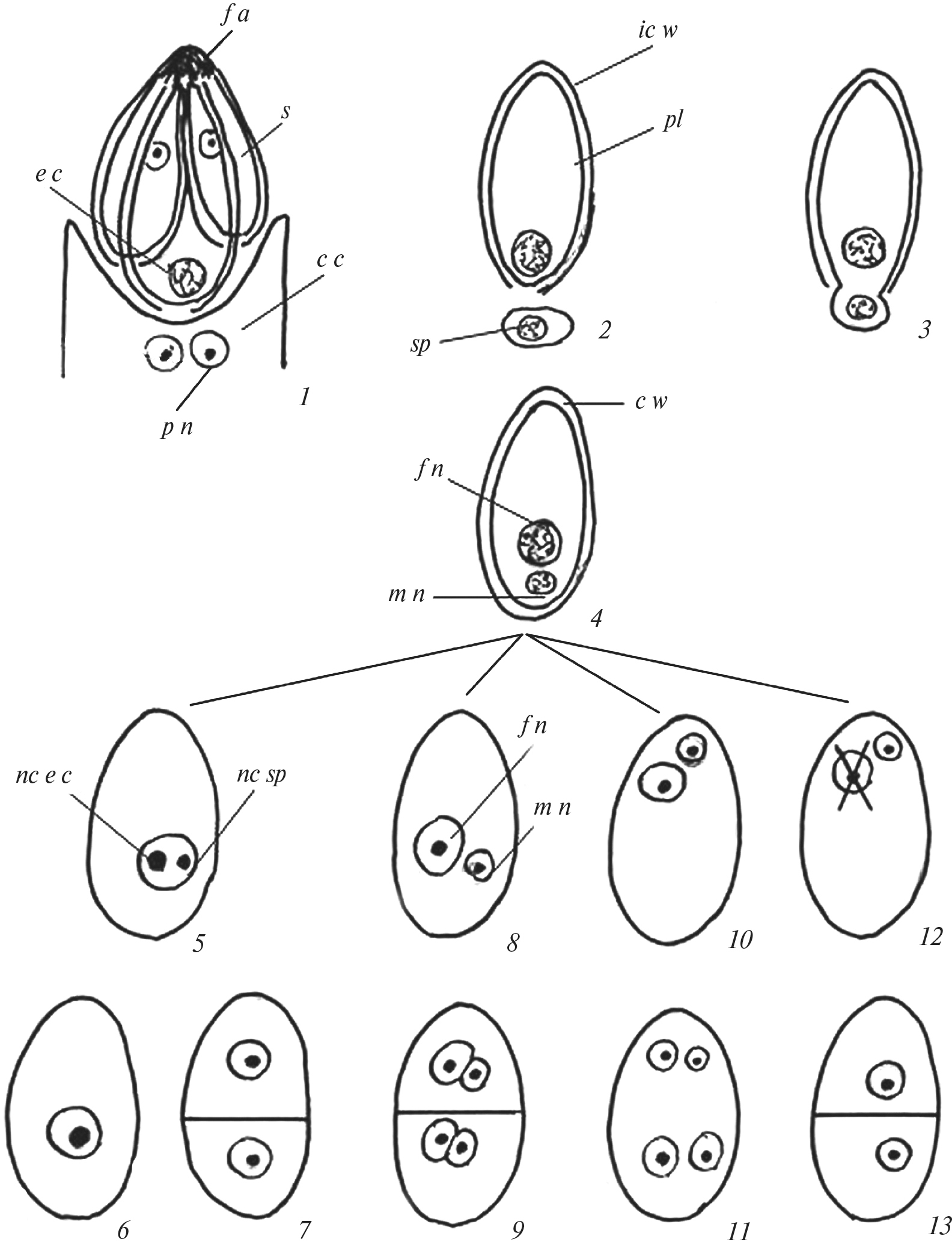 Fig. 7. Fertlization types in flowering plants. 1 – Female Germ Unit (in the apical parts of the egg and synergids, the cell wall is absent; the central cell, synergids, and egg cell in the area of contact with male gametes are covered with a plasmalemma), 2 – sperm is located near the female gamete, 3 – fusion of the plasma membranes of gametes, 4 – plasmogamy is finished, and the cell wall around the developing zygote becomes complete, 5–13 – passage of karyogamy in different fertilization types; complete syngamy: 5–7 – premitotic type: fusion of the female and male nuclei (4), release of the nucleoli (5), formation of the zygote (6) and 2-celled embryo (7); 8, 9 – postmitotic type: contact of the female and male nuclei (8), and their union at the stage of 2-celled embryo (9); incomplete syngamy: 10, 11 – gynandrogamic type: lack of fusion of sex nuclei (10), their autonomous divisions (11); 12, 13 – androgamic type: replacement of the female nucleus by the male nucleus (12) and the formation of an embryo of only paternal origin (13). c c – central cell, c w – complete cell wall, e c – egg cell, f a – filiform apparatus, f n – female nucleus, ic w – incomplete cell wall, m n – male nucleus, nc sp – nucleolus of sperm, nc e c – nucleolus of egg cell, pl – plasmalemma, p n – polar nuclei, s – synergid, sp – sperm.