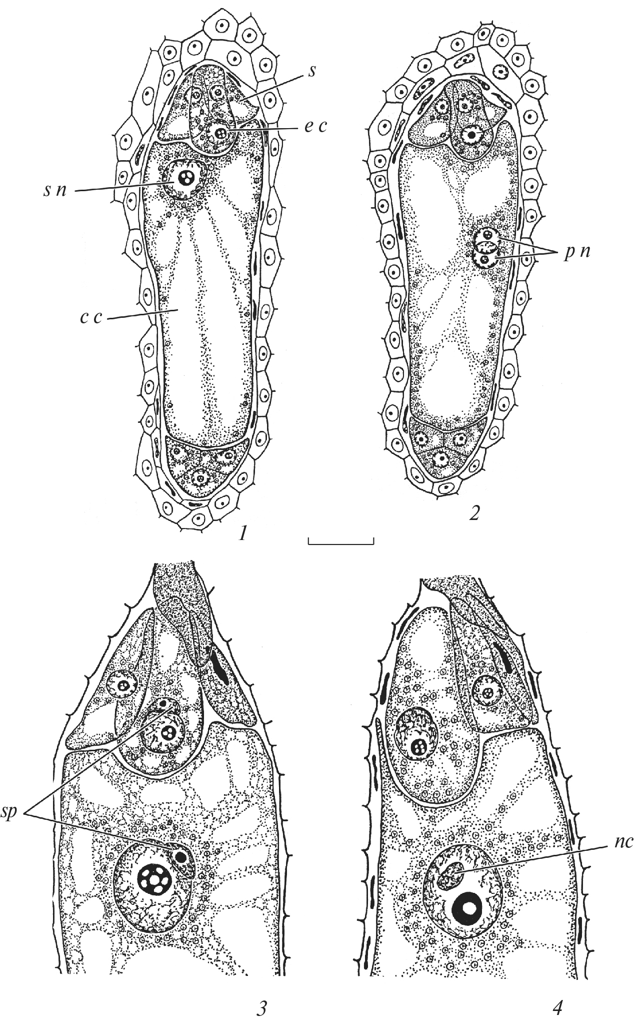 Fig. 8. Formed (1) and mature (2) embryo sacs, beginning of double fertlization (3) in Ceratophyllum submersum and completion of this process (4) in C. platyacanthum (Ceratophyllaceae) (after Shamrov, 1983). 1–3 – bilateral sections, 4 – sagittal section. c c – central cell, e c – egg cell, nc – nucleolus of sperm, s – synergid, s n – secondary nucleus of central cell, sp – sperm. Scale bar, µm: 30.