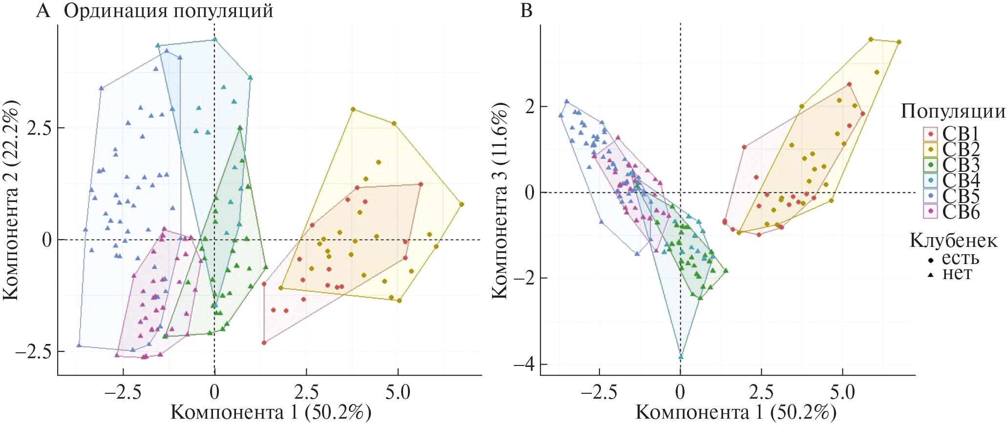 Рис. 2. Ординация популяций в плоскостях 1 и 2 компонент (А) и 1 и 3 компонент (В).