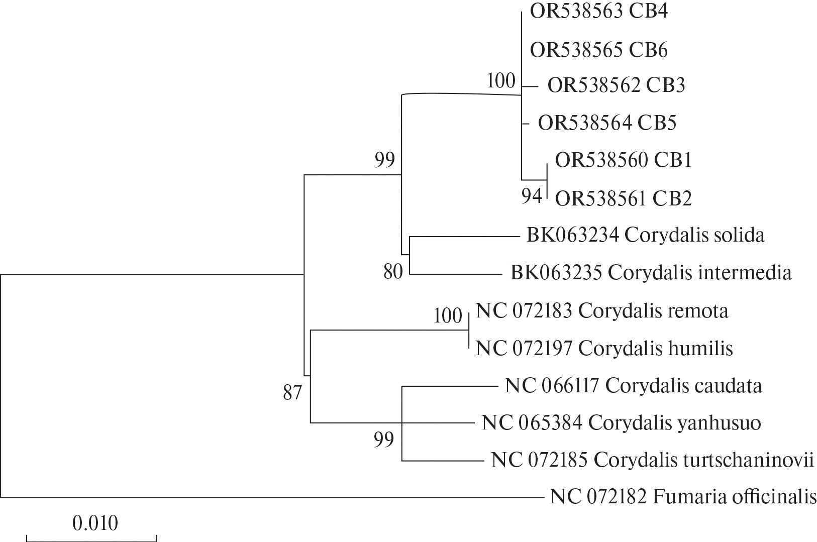 При построении филогенетических деревьев на основе анализа последовательностей ДНК гена matK и спейсера rpoB-trnC выявлена сходная топология. На рис. 5 приведено консенсусное дерево, построенное на основе анализа этих двух участков хлоропластной ДНК. Представители сибирских популяций C. bracteata с высокой степенью вероятности формируют отдельную кладу, занимающую терминальное положение. Причем особи из популяций СB1 и CB2 наиболее обособлены. Сестринскую с ними кладу образуют европейские виды Corydalis intermedia и Corydalis solida (L.) Clairv., имеющие фиолетово-розовые цветки. Отдельные клады образуют азиатские (дальневосточные, китайские, корейские) виды хохлаток, отличающиеся друг от друга цветом и размерами венчика, формой плодов и строением нектарника. Согласно классификации М. Лидена, все приведенные виды хохлаток относятся к секции Corydalis (Liden, Zetterlund, 1997).