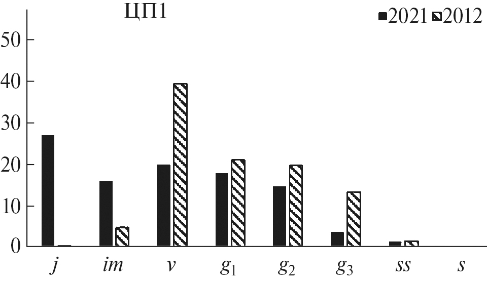 В ценопопуляции 2 за 9 лет тип онтогенетического спектра изменился с правостороннего на левосторонний (рис. 2). В 2012 г. спектр правосторонний, отсутствуют особи ювенильного и имматурного состояний, низкая доля виргинильных растений (1.8%), подъем числа особей в молодом и зрелом генеративных состояниях с пиком на старом генеративном состоянии и снижение численности растений постгенеративного периода. В 2021 г. спектр левосторонний с большой долей (от 18.2 до 24.6) молодых особей (j, im, v и g1) и снижением числа растений зрелого (14.7%) и старого (0.9%) генеративных состояний, отсутствие особей постгенеративного периода.