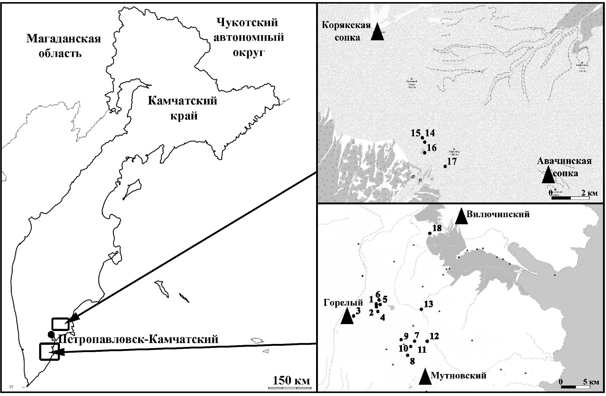 В августе 2020 г. отобрано 18 проб почв и пирокластических отложений с вулканов Корякский, Авачинский, Вилючинский, Горелый и Мутновский (рис. 1) с использованием стандартных методов (Gollerbach, Shtina, 1969). Определение типов почв проводили согласно российской классификации (Klassifikatsiya…, 2004). Характеристики и координаты точек сбора проб указаны в таблице 1. Названия видов высших растений приведены по сводке “Сосудистые растения советского Дальнего Востока” (Kharkevich, 1985–1996) с учетом номенклатурных изменений и дополнений по “Каталогу флоры Камчатки” (Yakubov, Chernyagina, 2004).