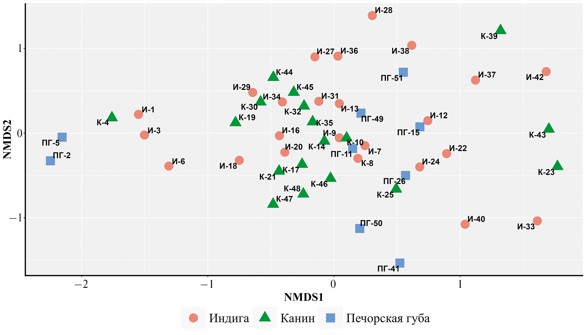 Для анализа сходства видового состава сосудистых растений и мхов рассчитывали матрицу различий с использованием расстояния Эвклида. Для ординации геоботанических описаний применяли неметрическое многомерное шкалирование (Grohlina, Hanina, 2015). Расчеты проводили с помощью языка r (R Core Team, 2019), визуализацию данных – с помощью пакета ggplot2 (Wickham, 2016). На рис. 2 представлена графическая интерпретация неметрического многомерного шкалирования, основанного на сравнении флористического сходства геоботанических описаний, выполненных в трёх географических точках: И – геоботанические описания галофитной растительности эстуария р. Индиги, ПГ – геоботанические описания в устьях рек южного побережья Печорской губы, К – геоботанические описания в эстуариях рек п-ова Канин. Под номерами представлены ассоциации с совокупностью описаний их растительных сообществ. В статье названия таксонов приведены согласно систематической сводке С.К. Черепанова (Czerepanov, 1995).