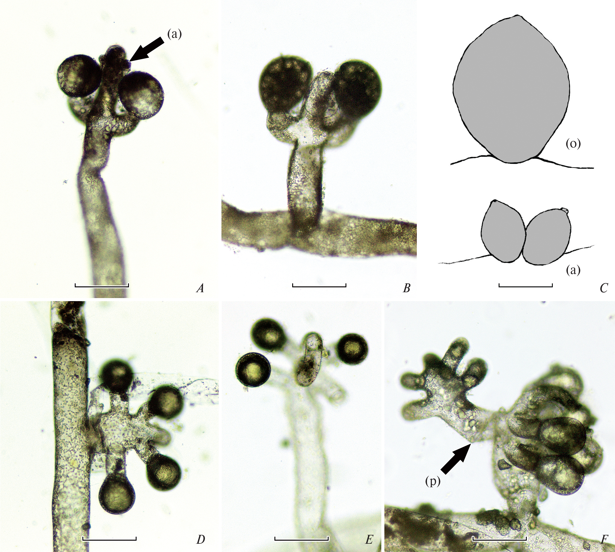Рис. 1. Морфология Vaucheria из Армении и Азербайджана: A, B – V. canalicularis, антеридий (a) показан стрелкой; C – V. dichotoma, оогоний (о) и группа антеридиев (а); D–F – V. racemosa, пролиферация (p) генеративной ветви показана стрелкой. Масштабные линейки: 100 µm.