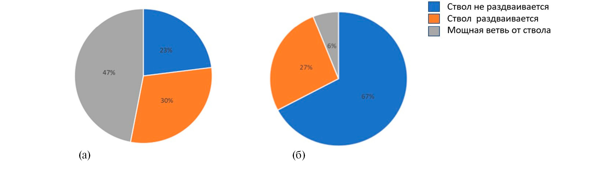 Рис. 7. Процентное соотношение деревьев Betula рendula, произрастающих на открытом пространстве (а) и в насаждениях (б) (выборка 30 особей для каждого варианта произрастания): без раздвоения ствола, с раздвоением ствола, с образованием мощной ветви.
