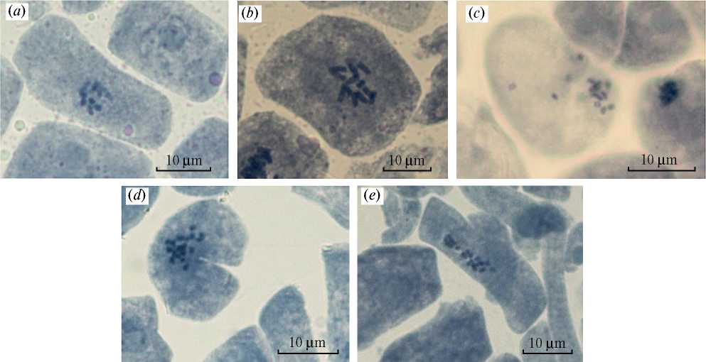 Рис. 1. Метафазные пластинки: a – Dracocephalum discolor (2n = 12); b – Nepeta multifida (2n = 12); c – Nepeta sibirica (2n = 18); d, e – Thymus petraeus (2n = 20).