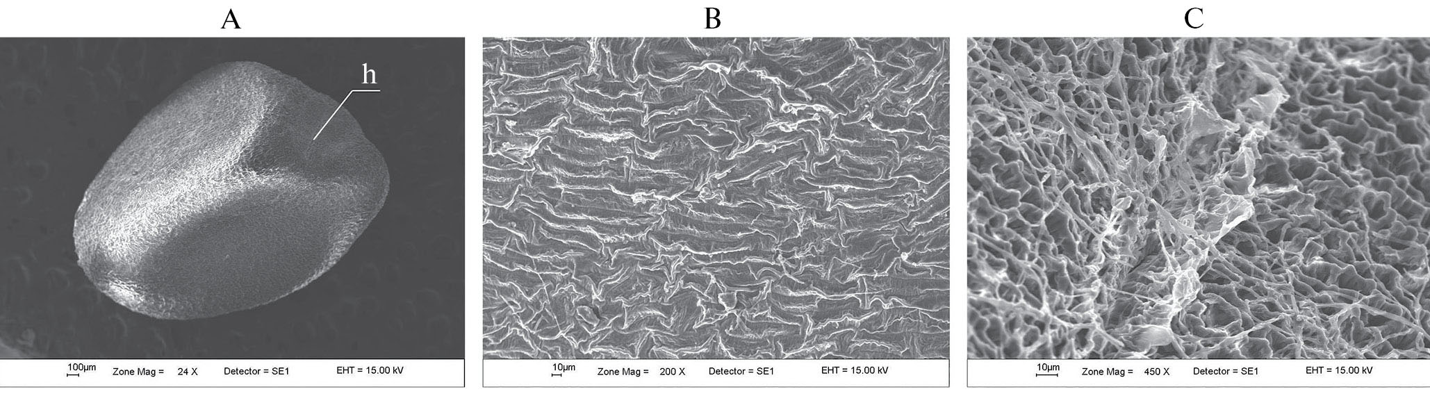 Fig. 1. Seed of Cuscuta japonica. A – general view of the seed from the ventral side, B – exotesta cells on the ventral side of the seed, C – fragment of the seed hilum; h – seed hilum.