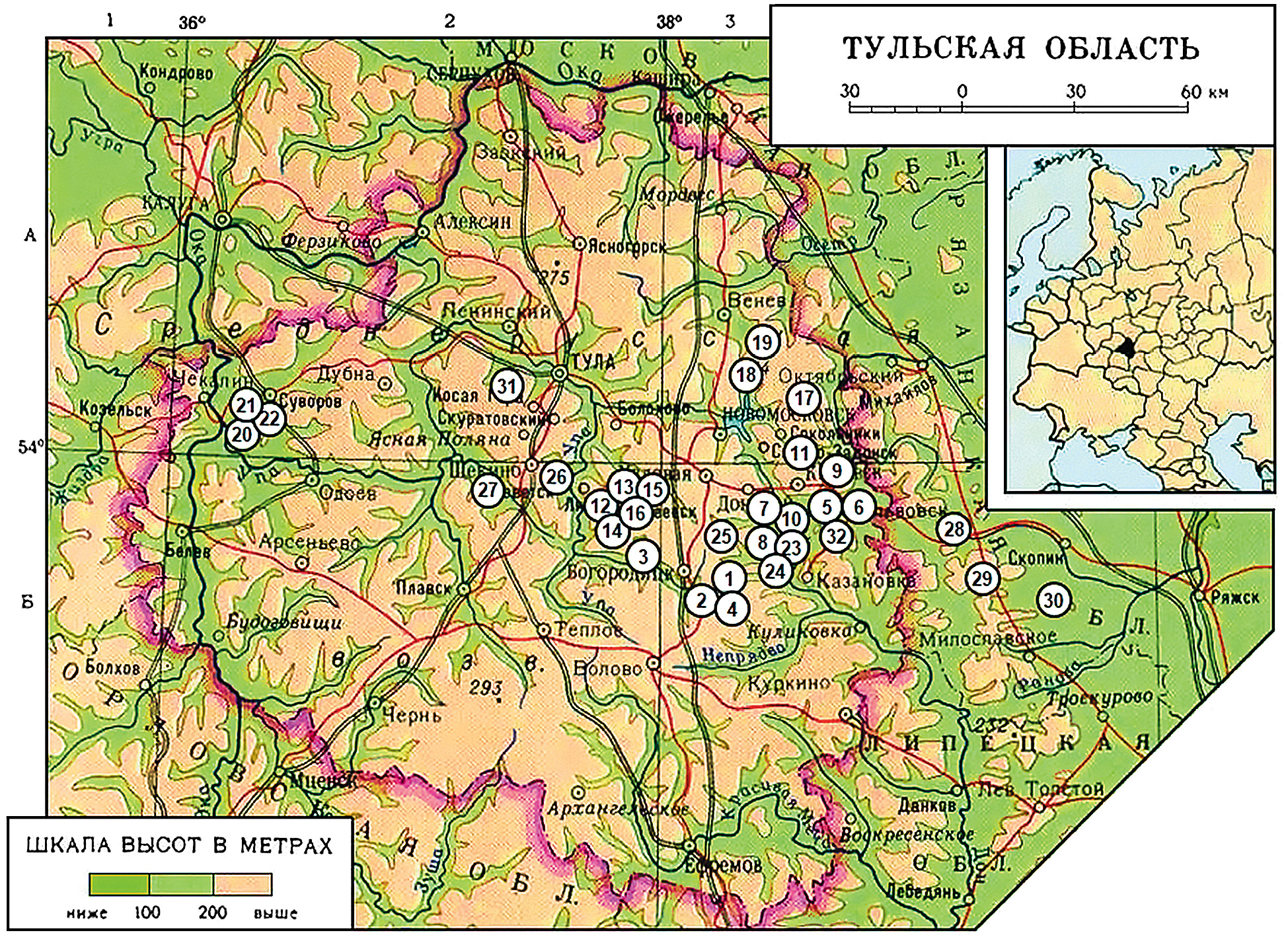 Сборы мохообразных на территории южной части Подмосковного буроугольного бассейна (Тульская, Рязанская области) проводились маршрутным методом в течение 2018–2023 гг. Камеральная обработка осуществлялась с применением общепринятых бриологических методик. Изучено более 30 объектов – как отдельных терриконов, так и крупных карьерно-озерных комплексов. Идентифицировано около 500 образцов. Гербарные сборы мохообразных хранятся в фондовом гербарии заповедника “Галичья гора” (VU). Номенклатура видов дана по сводкам мхов и печеночников России: (Potemkin, Sofronova, 2009; Moss flora of Russia, 2017; 2018; 2020, 2022). Некоторые объекты проиллюстрированы фотографиями автора. Принятые сокращения: ТУЛ – Тульская, РЯЗ – Рязанская области. Пункты сбора (рис. 1) пронумерованы: