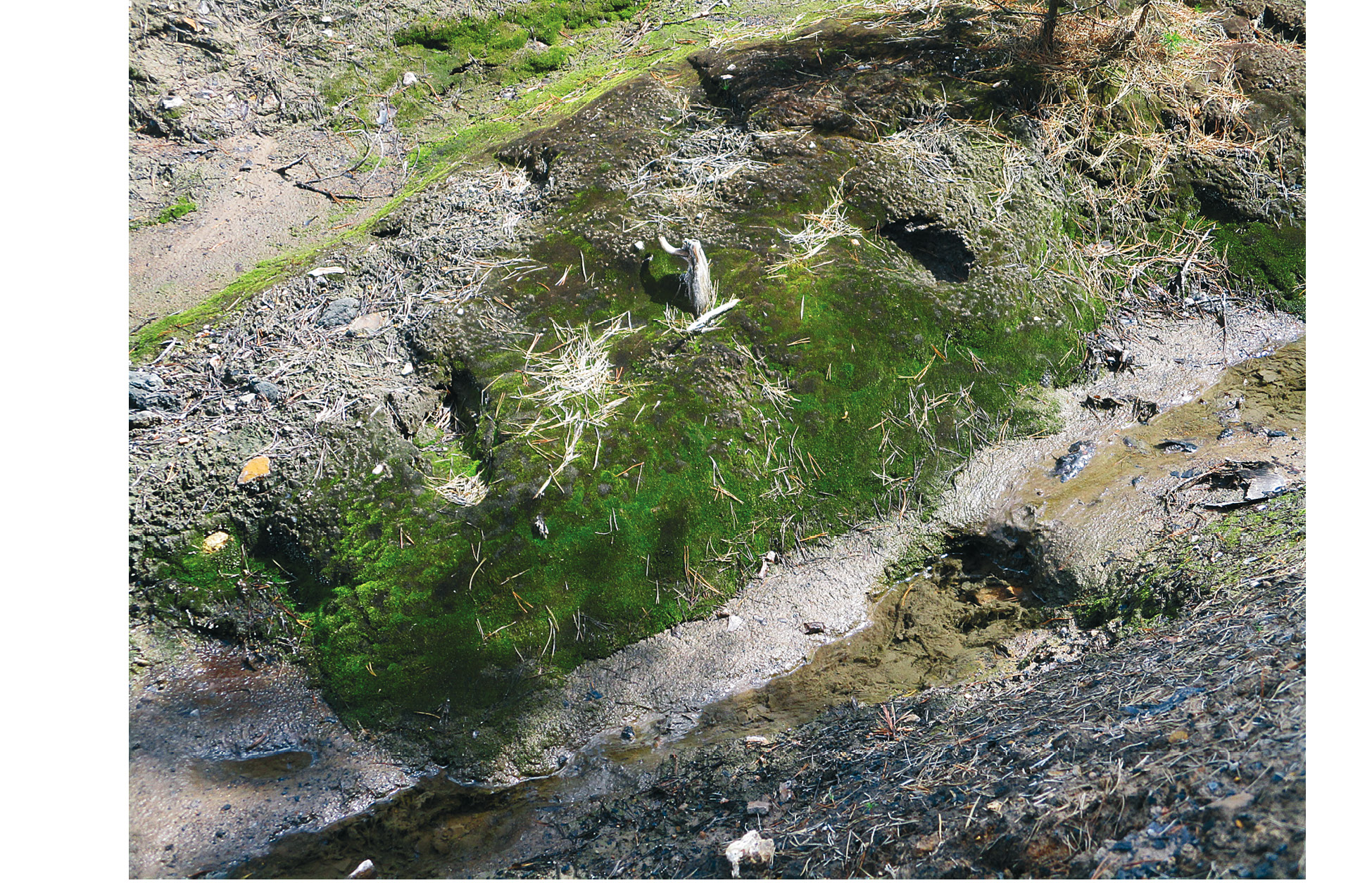 Аквальные ландшафты (озера, берега озер, мелководные пересыхающие озерца стоки выклинивающихся подземных вод – рис. 8, обводненные канавы) – одни из самых богатых по видовому составу структурных элементов карьерно-озерных комплексов (около 40 видов). Закономерно преобладают мезогигрофильные и гигрофильные виды, наиболее часты и обильны Bryum pseudotriquetrum, Calliergonella cuspidata, Drepanocladus aduncus, Hygroamblystegium humile, Leptodictyum riparium, Marchantia polymorpha, Pellia endiviifolia, Pohlia wahlenbergii. Преимущественно на северо-западе Подмосковного буроугольного бассейна, в аквальных ландшафтах отмечены Aulacomnium palustre, Helodium blandowii, Plagiomnium elatum, Polytrichum commune, Sphagnum fallax, S. squarrosum, Riccia fluitans, Warnstorfia fluitans, Warnstorfia pseudostraminea, ряд из них характерен для минеротрофных болот. В аквальных ландшафтах угледобывающих районов Восточной Сибири отмечены лишь Warnstorfia fluitans, Calliergon giganteum, Marchantia polymorpha (Efimov, 2016), видимо, собранные попутно, наряду с сосудистыми макрофитами.