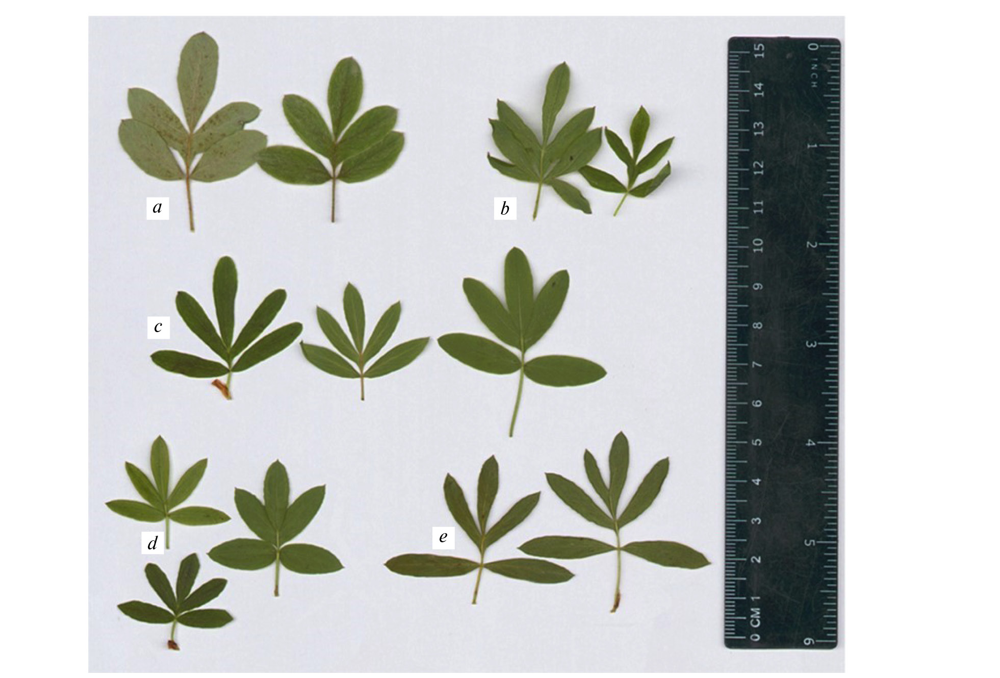Fig. 3. Leaf morphology of Dasiphora mandshurica ( a ), D. gorovoii ( b ), D. fruticosa ( c ), D. davurica ( d ), D. flava ( e ).