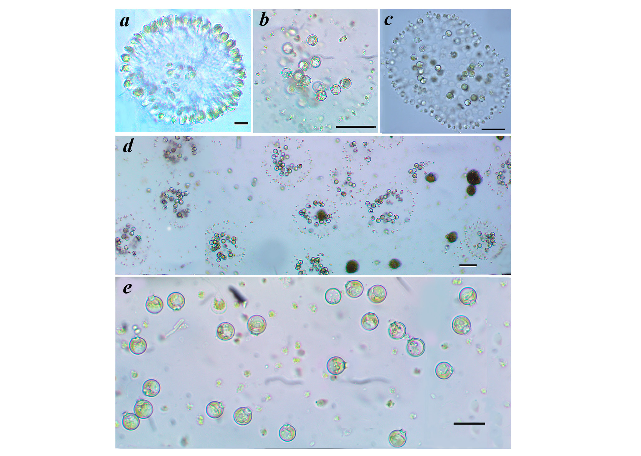 Форма исследованных колоний U. kukkii была от сферической до эллипсоидной (95–120 × 112–175 мкм), наиболее частый размер 110 × 140 мкм. Клетки имели грушевидную форму, 7–10 × × 6–7 мкм, с двумя неравными по длине жгутиками на переднем конце. Задняя часть клетки соединена тонкими разветвленными тяжами, погруженными в общую колониальную слизь. Клетки были округлой формы с одним хлоропластом (рис. 2 а , b ). Колонии петербургской популяции находились в стадии деления (рис. 2 с ) и имели более крупные размеры (табл. 2).