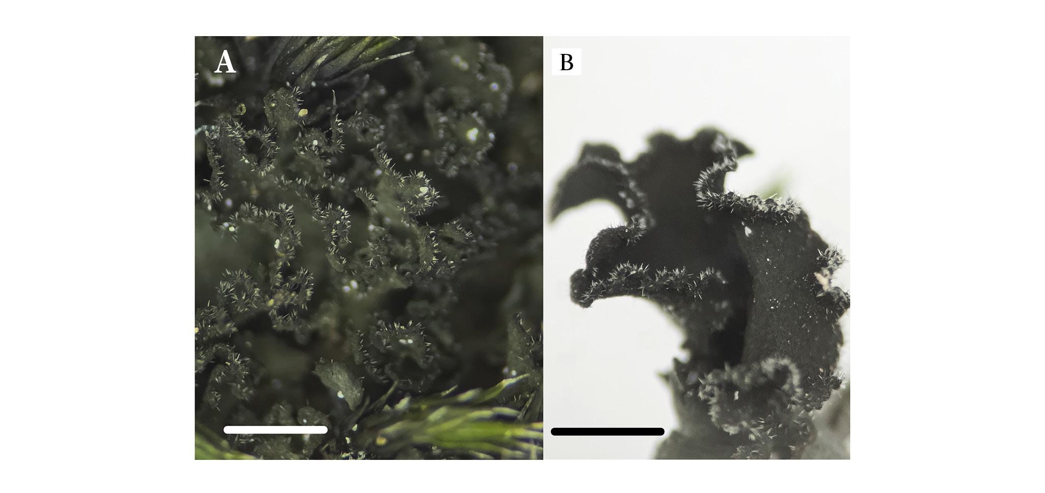 Description: Thallus foliose, to 3 cm diam. Lobes erect, 1–3 mm wide, blackish-olive-green, not pruinose, 80–100 µm thick, with rounded ends and undulate to crenulate, often ascending margins bearing abundant, thin, transparent hairs (about 0.1 mm long). Rhizines sparse, white, fasciculate, 0.35–0.7 mm long. Isidia sometimes present in center of mature lobes, black, globose, to 0.1 mm diam. Upper and lower cortex only partly developed, paraplectenchymatous, formed by 1–3 layers of cells. Medulla present between two photobiont layers. Apothecia not seen in Dagestan material, their description is provided according to literature (Arcadia, 2023): 0.7–1.6 mm diam., slightly concave to slightly convex, not pruinose with hairy proper margin. Disc brown. Thalline margin present, persistent but very thin, smooth; in section: 100 µm wide, with distinct cellular cortex. Exciple sometimes visible externally as a thin ring, darker brown than disc; in section: 50–70 µm wide, colourless except at surface which is orange-brown, of prominent large cells, 5–14 × 5–10 µm, long axis oriented in outward direction. Epithecium orange-brown, K–. Hymenium 90–100 µm tall, colourless, KI+ blue. Hypothecium 50 µm tall, colourless, lower part distinctly cellular, long axis of cells horizontal, cellular layer continuous with exciple. Paraphyses simple, with conspicuous septa, expanding gradually from 1.5 µm at base to 3 µm at apex, not capitate, sometimes slightly moniliform. Asci 60 × 20 µm, variable in shape, cylindrical, narrowly clavate, or bulging at the middle, KI+ blue in a narrow arc at the tip (without obvious structure). Ascospores colourless, 1-septate, constricted at septum, ±narrowly ellipsoid though ends sometimes slightly pointed 25–30 × 8–10 µm, 8 per ascus. Photobiont blue-green (nostocoid), cells globose, 5–8 µm diam., sometimes in chains, forming two distinct but ±identical layers separated by a layer with no or few photobiont cells. Both photobiont layers continuous and regular.
