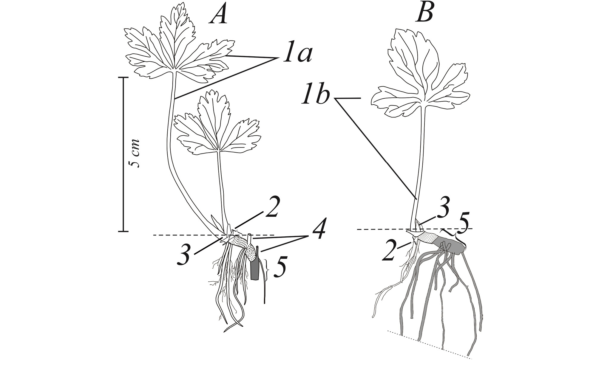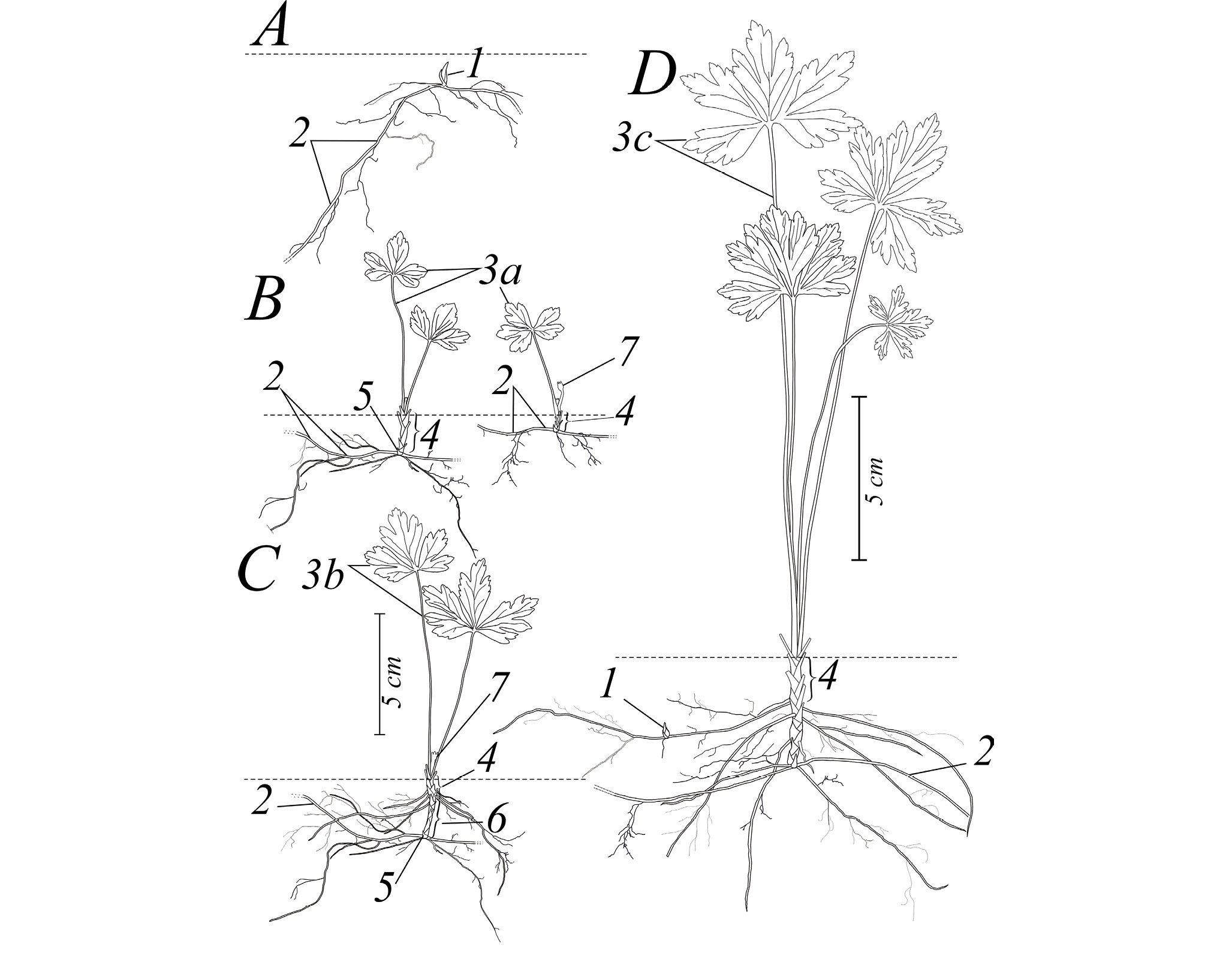 Ювенильные растения (j) вегетативного происхождения возникают из придаточных (адвентивных) почек, которые формируются обычно на горизонтально расположенных корнях более взрослых особей (рис. 1, 2A). Эти корни, как правило, расположены на глубине 3–10 см. Адвентивная почка, развивающаяся на корне, закрыта чешуевидными листьями. Из нее формируется побег n-го порядка, базальная часть которого расположена в почве. Этот подземный участок побега представляет собой первый прирост корневища (гипогеогенный по происхождению) и включается в состав осевой многолетней части побеговой системы молодого растения. Длина геофильного участка корневища зависит от глубины залегания придаточной почки. Если корень расположен близко к поверхности почвы, то формируется участок корневища небольших размеров. При глубоком заложении прирост увеличивается за счет значительной длины междоузлий метамеров (рис. 2B). Достигнув поверхности почвы, корневой отпрыск формирует из верхушечной почки надземный розеточный побег (рис. 2). Растение-отпрыск на данной стадии онтогенеза представляет собой однопобеговую партикулу. Надземный розеточный побег несет открытую верхушечную почку и два листа ювенильного типа (см. табл. 1). Их листовые пластинки тройчато рассеченные: верхний сегмент листа цельный с пильчатым краем в верхней трети, а два нижних сегмента, как правило, имеют две лопасти или доли (рис. 3, 1–3). У части ювенильных особей не образуются придаточные корни, поскольку питание осуществляется за счет связи с материнским растением. Однако обособление партикул происходит достаточно быстро. Большинство ювенильных растений, которые были выкопаны при исследовании, отделены от материнских организмов. Причины разделения трудноопределимы, по нашим наблюдениям это может происходить под воздействием роющих животных. Партикулы становятся способны к самостоятельному существованию, когда у растений формируется своя корневая система кистевого типа. Средняя продолжительность j состояния – один год, иногда затягивается до трех лет. В случае если растение остается ювенильным в течение 2–3 лет, осевые части прошлогодних укороченных приростов побега втягиваются придаточными корнями в почву, образуя эпигеогенный участок корневища, и, таким образом, корневище становится смешанным – гипоэпигеогенным.