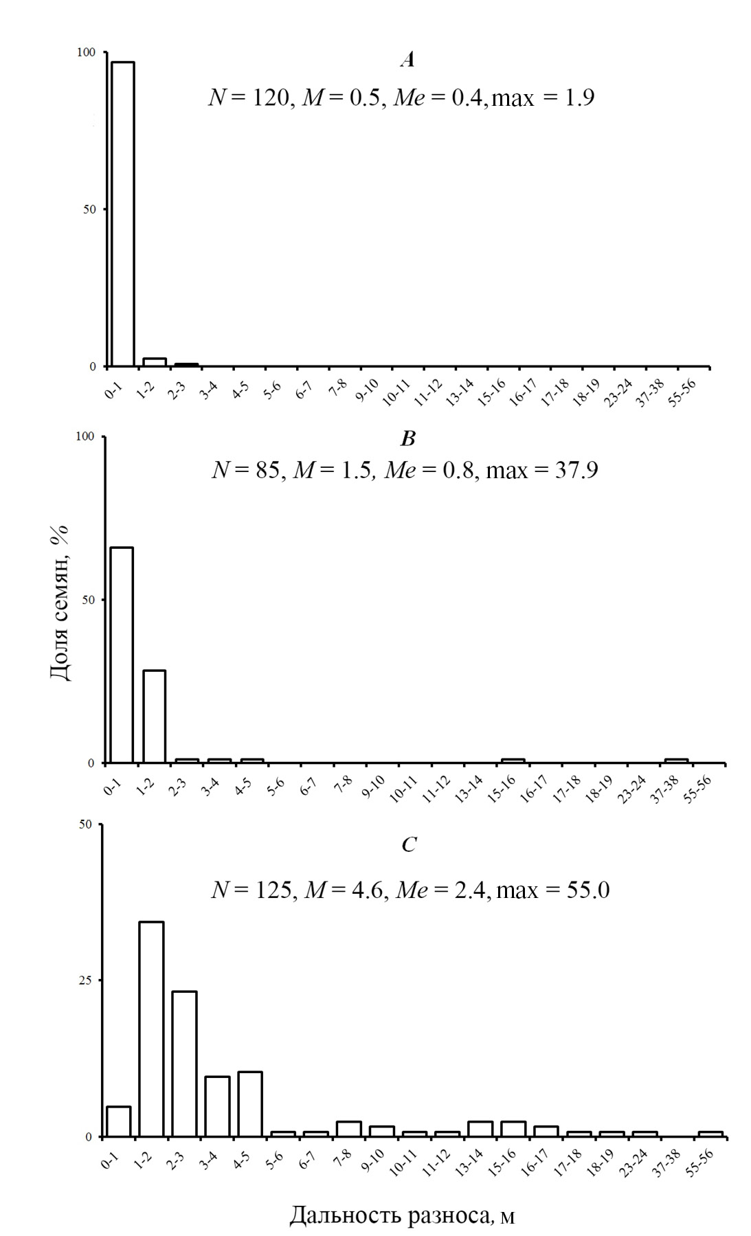 X-axis – range of seed dispersion, m, Y-axis – percentage of the total number of seeds.